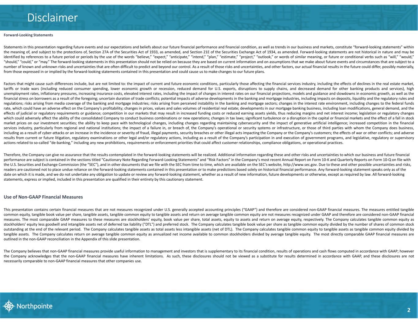 Disclaimer Forward-Looking Statements Statements in this presentation regarding future events and our expectations and beliefs about our future financial performance and financial condition, as well as trends in our business and markets, constitute “forward-looking statements” within the meaning of, and subject to the protections of, Section 27A of the Securities Act of 1933, as amended, and Section 21E of the Securities Exchange Act of 1934, as amended. Forward-looking statements are not historical in nature and may be identified by references to a future period or periods by the use of the words “believe,” “expect,” “anticipate,” “intend,” “plan,” “estimate,” “project,” “outlook,” or words of similar meaning, or future or conditional verbs such as “will,” “would,” “should,” “could,” or “may.” The forward-looking statements in this presentation should not be relied on because they are based on current information and on assumptions that we make about future events and circumstances that are subject to a number of known and unknown risks and uncertainties that are often difficult to predict and beyond our control. As a result of those risks and uncertainties, and other factors, our actual financial results in the future could differ, possibly materially, from those expressed in or implied by the forward-looking statements contained in this presentation and could cause us to make changes to our future plans. Factors that might cause such differences include, but are not limited to: the impact of current and future economic conditions, particularly those affecting the financial services industry, including the effects of declines in the real estate market, tariffs or trade wars (including reduced consumer spending, lower economic growth or recession, reduced demand for U.S. exports, disruptions to supply chains, and decreased demand for other banking products and services), high unemployment rates, inflationary pressures, increasing insurance costs, elevated interest rates, including the impact of changes in interest rates on our financial projections, models and guidance and slowdowns in economic growth, as well as the financial stress on borrowers as a result of the foregoing; uncertain duration of trade conflicts; potential impacts of adverse developments in the banking and mortgage industries, including impacts on deposits, liquidity and the regulatory rules and regulations; risks arising from media coverage of the banking and mortgage industries; risks arising from perceived instability in the banking and mortgage sectors; changes in the interest rate environment, including changes to the federal funds rate, which could have an adverse effect on the Company’s profitability; changes in prices, values and sales volumes of residential real estate; developments in our mortgage banking business, including loan modifications, general demand, and the effects of judicial or regulatory requirements or guidance; competition in our markets that may result in increased funding costs or reduced earning assets yields, thus reducing margins and net interest income; legislation or regulatory changes which could adversely affect the ability of the consolidated Company to conduct business combinations or new operations; changes in tax laws; significant turbulence or a disruption in the capital or financial markets and the effect of a fall in stock market prices on our investment securities; the ability to keep pace with technological changes, including changes regarding maintaining cybersecurity and the impact of generative artificial intelligence; increased competition in the financial services industry, particularly from regional and national institutions; the impact of a failure in, or breach of, the Company's operational or security systems or infrastructure, or those of third parties with whom the Company does business, including as a result of cyber-attacks or an increase in the incidence or severity of fraud, illegal payments, security breaches or other illegal acts impacting the Company or the Company's customers; the effects of war or other conflicts; and adverse results from current or future litigation, regulatory examinations or other legal and/or regulatory actions, including as a result of the Company’s participation in and execution of government programs, and legislative, regulatory or supervisory actions related to so-called “de-banking,” including any new prohibitions, requirements or enforcement priorities that could affect customer relationships, compliance obligations, or operational practices. Therefore, the Company can give no assurance that the results contemplated in the forward-looking statements will be realized. Additional information regarding these and other risks and uncertainties to which our business and future financial performance are subject is contained in the sections titled “Cautionary Note Regarding Forward-Looking Statements” and “Risk Factors” in the Company’s most recent Annual Report on Form 10-K and Quarterly Reports on Form 10-Q on file with the U.S. Securities and Exchange Commission (the “SEC”), and in other documents that we file with the SEC from time to time, which are available on the SEC’s website, http://www.sec.gov. Due to these and other possible uncertainties and risks, readers are cautioned not to place undue reliance on the forward-looking statements contained in this presentation or to make predictions based solely on historical financial performance. Any forward-looking statement speaks only as of the date on which it is made, and we do not undertake any obligation to update or review any forward-looking statement, whether as a result of new information, future developments or otherwise, except as required by law. All forward-looking statements, express or implied, included in this presentation are qualified in their entirety by this cautionary statement. 2 Use of