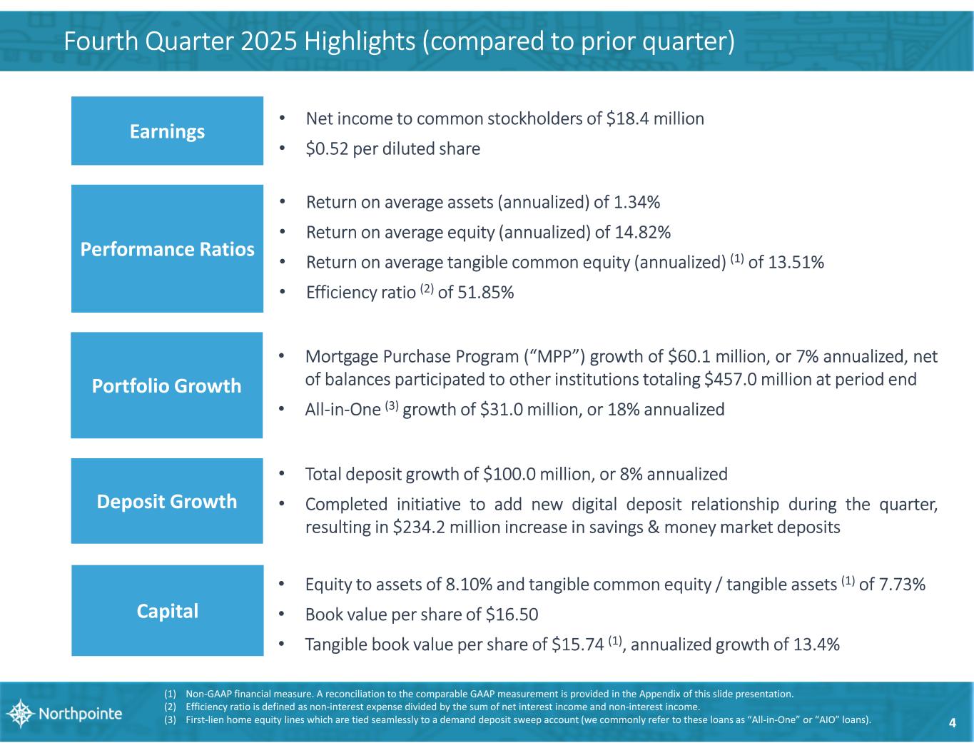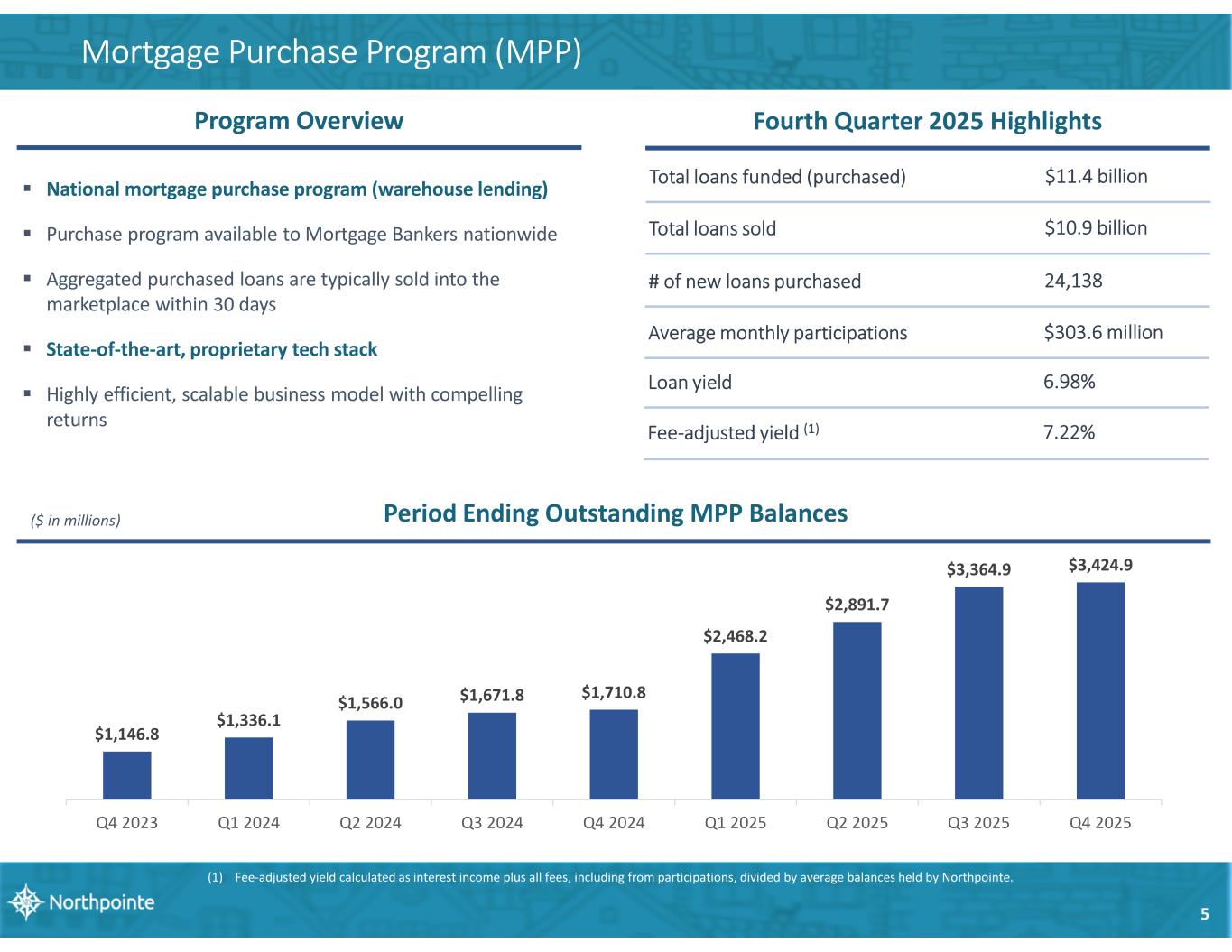 Fourth Quarter 2025 Highlights (compared to prior quarter) 4 Earnings • Net income to common stockholders of $18.4 million • $0.52 per diluted share Performance Ratios • Return on average assets (annualized) of 1.34% • Return on average equity (annualized) of 14.82% • Return on average tangible common equity (annualized) (1) of 13.51% • Efficiency ratio (2) of 51.85% Portfolio Growth • Mortgage Purchase Program (“MPP”) growth of $60.1 million, or 7% annualized, net of balances participated to other institutions totaling $457.0 million at period end • All-in-One (3) growth of $31.0 million, or 18% annualized Deposit Growth • Total deposit growth of $100.0 million, or 8% annualized • Completed initiative to add new digital deposit relationship during the quarter, resulting in $234.2 million increase in savings & money market deposits (1) Non-GAAP financial measure. A reconciliation to the comparable GAAP measurement is provided in the Appendix of this slide presentation. (2) Efficiency ratio is defined as non-interest expense divided by the sum of net interest income and non-interest income. (3) First-lien home equity lines which are tied seamlessly to a demand deposit sweep account (we commonly refer to these loans as “All-in-One” or “AIO” loans). • Equity to assets of 8.10% and tangible common equity / tangible assets (1) of 7.73% • Book value per share of $16.50 • Tangible book value per share of $15.74 (1), annualized growth of 13.4% Capital