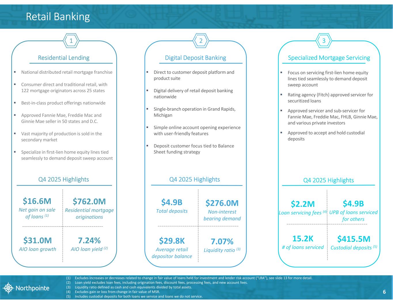 5 Mortgage Purchase Program (MPP) Period Ending Outstanding MPP Balances($ in millions) $1,146.8 $1,336.1 $1,566.0 $1,671.8 $1,710.8 $2,468.2 $2,891.7 $3,364.9 $3,424.9 Q4 2023 Q1 2024 Q2 2024 Q3 2024 Q4 2024 Q1 2025 Q2 2025 Q3 2025 Q4 2025 Fourth Quarter 2025 Highlights Total loans funded (purchased) $11.4 billion Total loans sold $10.9 billion # of new loans purchased 24,138 Average monthly participations $303.6 million Loan yield 6.98% Fee-adjusted yield (1) 7.22% (1) Fee-adjusted yield calculated as interest income plus all fees, including from participations, divided by average balances held by Northpointe. Program Overview National mortgage purchase program (warehouse lending) Purchase program available to Mortgage Bankers nationwide Aggregated purchased loans are typically sold into the marketplace within 30 days State-of-the-art, proprietary tech stack Highly efficient, scalable business model with compelling returns