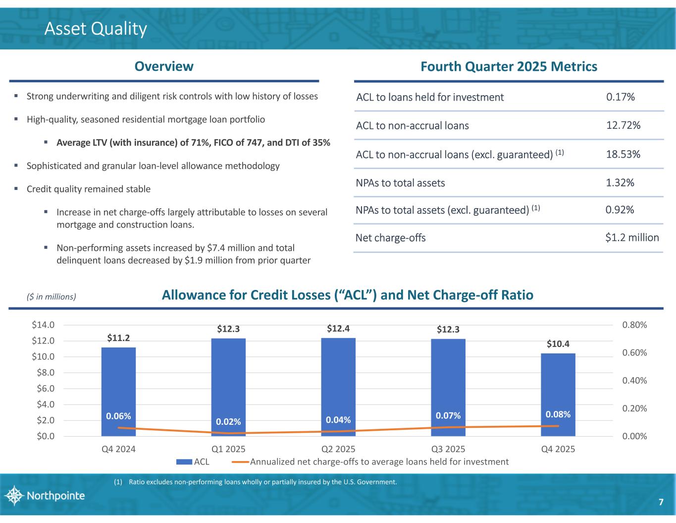 National distributed retail mortgage franchise Consumer direct and traditional retail, with 122 mortgage originators across 25 states Best-in-class product offerings nationwide Approved Fannie Mae, Freddie Mac and Ginnie Mae seller in 50 states and D.C. Vast majority of production is sold in the secondary market Specialize in first-lien home equity lines tied seamlessly to demand deposit sweep account $16.6M Net gain on sale of loans (1) $762.0M Residential mortgage originations 7.24% AIO loan yield (2) Residential Lending Q4 2025 Highlights $31.0M AIO loan growth Focus on servicing first-lien home equity lines tied seamlessly to demand deposit sweep account Rating agency (Fitch) approved servicer for securitized loans Approved servicer and sub-servicer for Fannie Mae, Freddie Mac, FHLB, Ginnie Mae, and various private investors Approved to accept and hold custodial deposits $4.9B UPB of loans serviced for others $2.2M Loan servicing fees (4) Specialized Mortgage Servicing Q4 2025 Highlights Direct to customer deposit platform and product suite Digital delivery of retail deposit banking nationwide Single-branch operation in Grand Rapids, Michigan Simple online account opening experience with user-friendly features Deposit customer focus tied to Balance Sheet funding strategy $4.9B Total deposits $276.0M Non-interest bearing demand Digital Deposit Banking Q4 2025 Highlights $29.8K Average retail depositor balance 7.07% Liquidity ratio (3) 15.2K # of loans serviced 6 Retail Banking 1 2 3 (1) Excludes increases or decreases related to change in fair value of loans held for investment and lender risk account (“LRA”), see slide 13 for more detail. (2) Loan yield excludes loan fees, including origination fees, discount fees, processing fees, and new account fees. (3) Liquidity ratio defined as cash and cash equivalents divided by total assets. (4) Excludes gain or loss from change in fair value of MSR. (5) Includes custodial deposits for both loans we service and loans we do not service. $415.5M Custodial deposits (5)