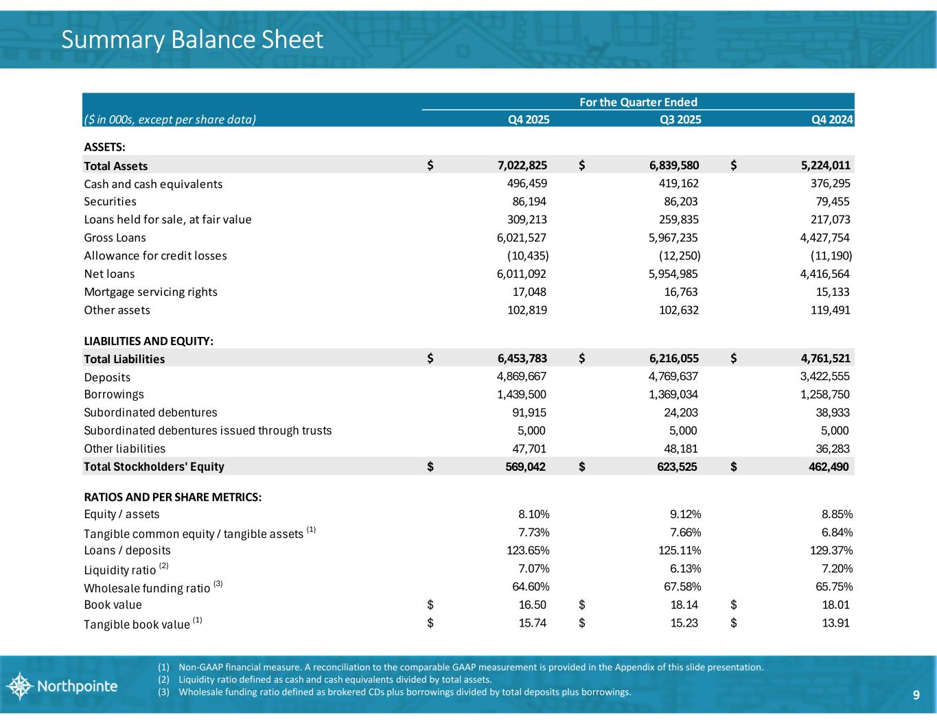 8 Summary Income Statement ($ in 000s, except per share data) Q4 2025 Q3 2025 Q4 2024 Interest income $ 106,123 $ 101,836 $ 82,701 Interest expense 62,626 61,505 52,679 Net interest income before provision 43,497 40,331 30,022 Provision (benefit) for credit losses and unfunded commitments (608) 828 (446) Net interest income after provision 44,105 39,503 30,468 Non-interest income 21,640 24,029 13,613 Non-interest expense 33,777 34,358 29,437 Income before income taxes 31,968 29,174 14,644 Income tax expense 8,325 7,001 3,656 Net Income 23,643 22,173 10,988 Preferred stock dividends 5,247 2,041 2,144 Net Income Available To Common Stockholders $ 18,396 $ 20,132 $ 8,844 Basic Earnings Per Share $ 0.53 $ 0.58 $ 0.34 Diluted Earnings Per Share $ 0.52 $ 0.57 $ 0.34 For the Quarter Ended