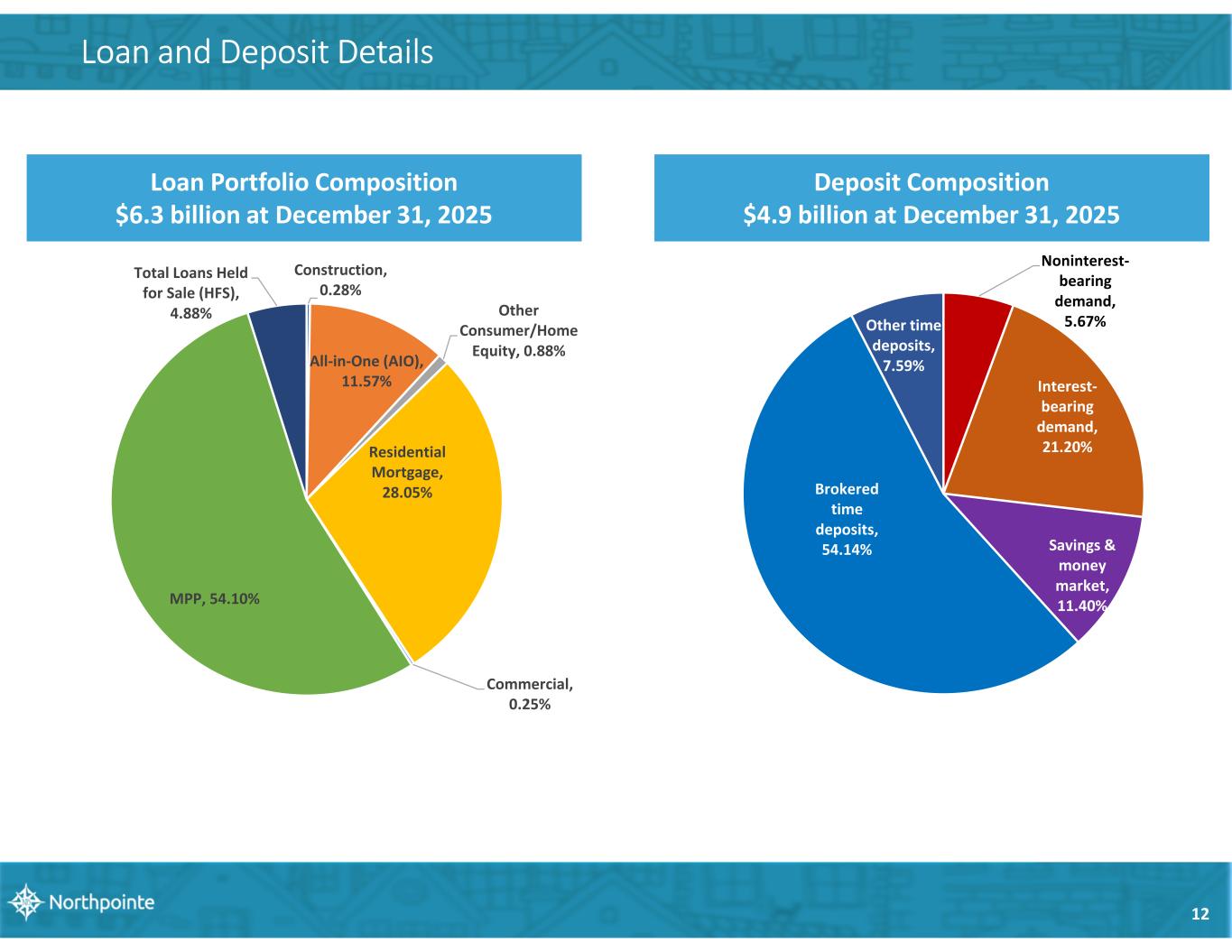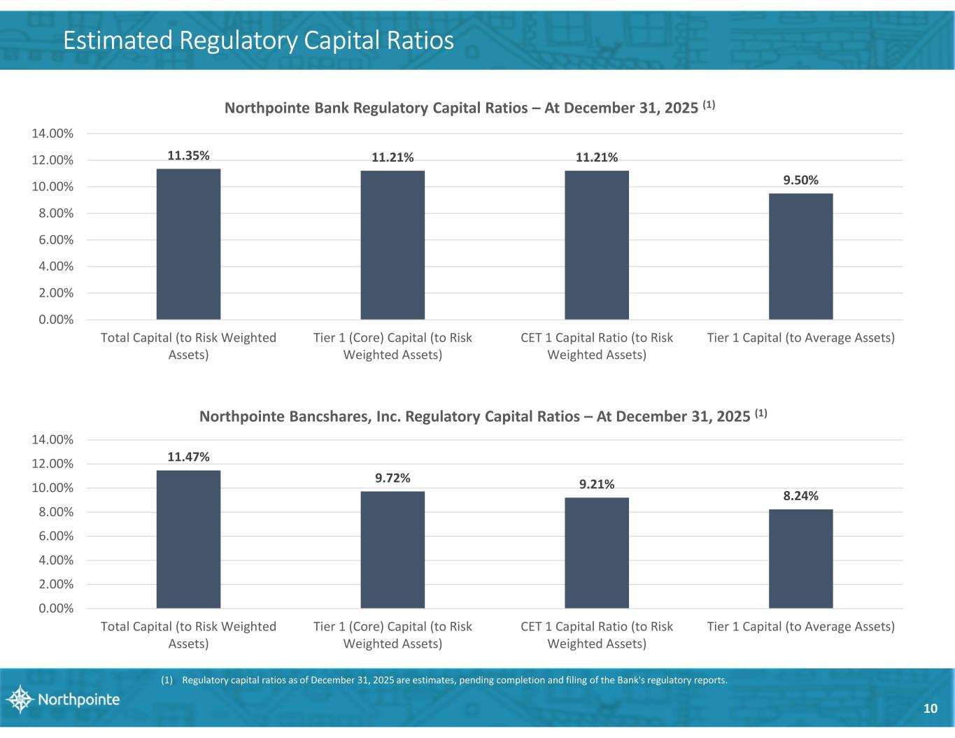 10 Estimated Regulatory Capital Ratios 11.35% 11.21% 11.21% 9.50% 0.00% 2.00% 4.00% 6.00% 8.00% 10.00% 12.00% 14.00% Total Capital (to Risk Weighted Assets) Tier 1 (Core) Capital (to Risk Weighted Assets) CET 1 Capital Ratio (to Risk Weighted Assets) Tier 1 Capital (to Average Assets) Northpointe Bank Regulatory Capital Ratios – At December 31, 2025 (1) (1) Regulatory capital ratios as of December 31, 2025 are estimates, pending completion and filing of the Bank's regulatory reports. 11.47% 9.72% 9.21% 8.24% 0.00% 2.00% 4.00% 6.00% 8.00% 10.00% 12.00% 14.00% Total Capital (to Risk Weighted Assets) Tier 1 (Core) Capital (to Risk Weighted Assets) CET 1 Capital Ratio (to Risk Weighted Assets) Tier 1 Capital (to Average Assets) Northpointe Bancshares, Inc. Regulatory Capital Ratios – At December 31, 2025 (1)