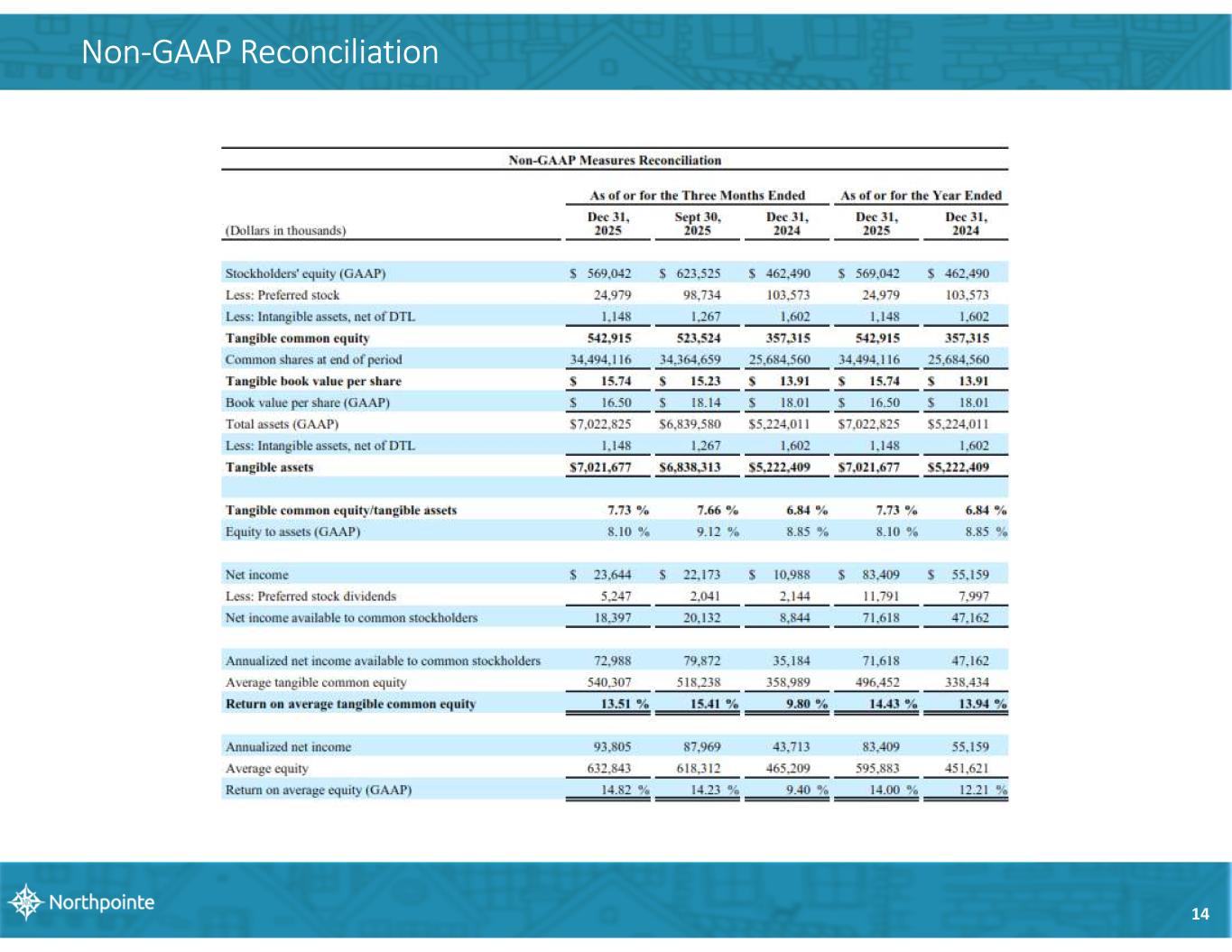 13 Fair Value Trends and Net Gain on Sale of Loans Reconciliation (in 000s) Fair Value Asset Income Statement Category Q4 2025 Q3 2025 Q4 2024 Mortgage servicing rights (MSR) Loan servicing fees (1,101)$ (910)$ 1,194$ Lender risk account (LRA) Net gain on sale of loans 606 1,547 (1,304) Loans held for investment (HFI) with fair value accounting Net gain on sale of loans 1,087 1,915 (5,944) Increase (Decrease) in Fair Value Recorded During Quarter Q4 2025 Q3 2025 Q4 2024 Total net gain on sale of loans 18,306$ 20,953$ 7,032$ Less: change in fair value of loans HFI and LRA (1,694) (2,229) 5,687 Less: Gain (loss) on sale of portfolio loans - (1,234) 1,562 Total net gain on sale of loans, excluding portfolio sales and LRA / HFI fair value adjustments 16,612$ 17,490$ 14,281$