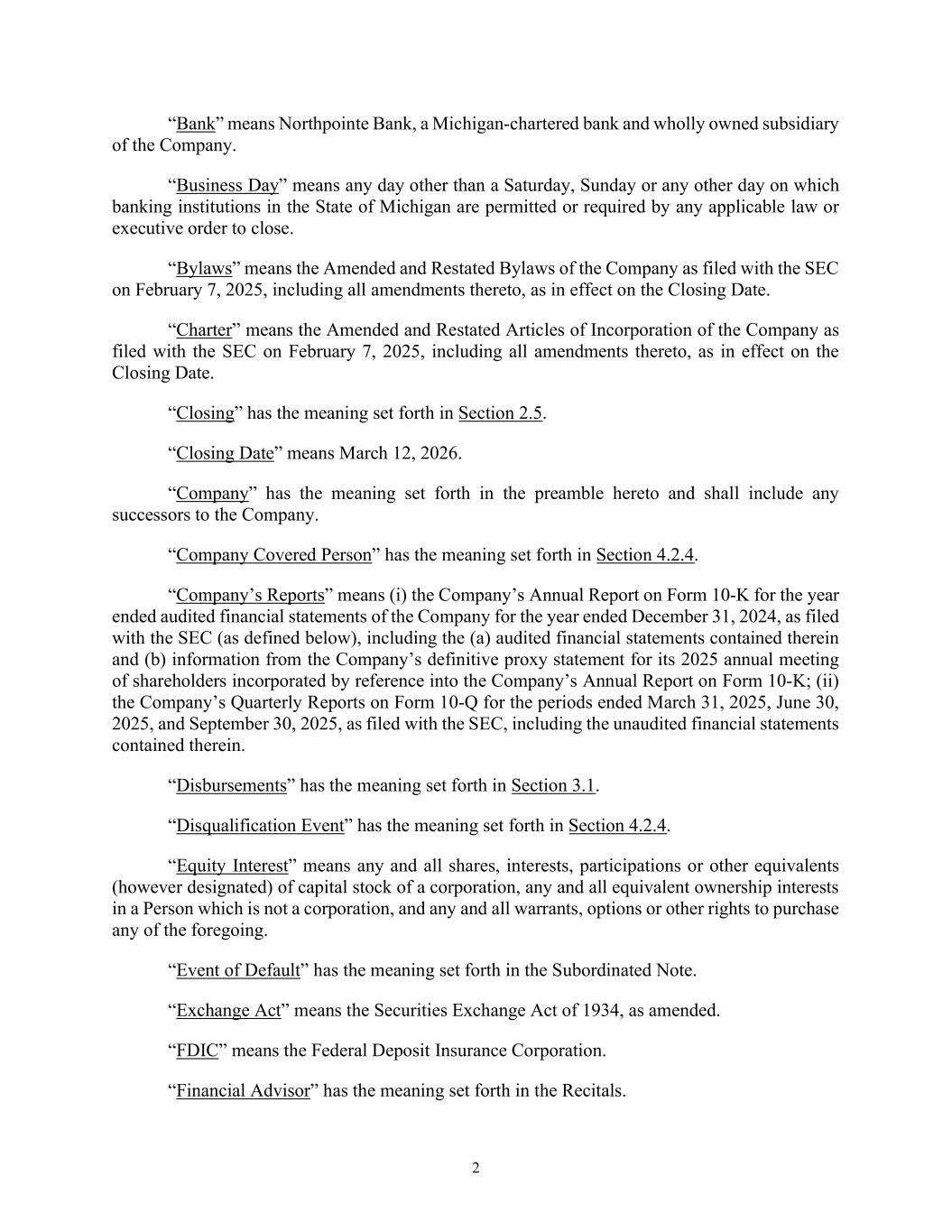 2 “Bank” means Northpointe Bank, a Michigan-chartered bank and wholly owned subsidiary of the Company. “Business Day” means any day other than a Saturday, Sunday or any other day on which banking institutions in the State of Michigan are permitted or required by any applicable law or executive order to close. “Bylaws” means the Amended and Restated Bylaws of the Company as filed with the SEC on February 7, 2025, including all amendments thereto, as in effect on the Closing Date. “Charter” means the Amended and Restated Articles of Incorporation of the Company as filed with the SEC on February 7, 2025, including all amendments thereto, as in effect on the Closing Date. “Closing” has the meaning set forth in Section 2.5. “Closing Date” means March 12, 2026. “Company” has the meaning set forth in the preamble hereto and shall include any successors to the Company. “Company Covered Person” has the meaning set forth in Section 4.2.4. “Company’s Reports” means (i) the Company’s Annual Report on Form 10-K for the year ended audited financial statements of the Company for the year ended December 31, 2024, as filed with the SEC (as defined below), including the (a) audited financial statements contained therein and (b) information from the Company’s definitive proxy statement for its 2025 annual meeting of shareholders incorporated by reference into the Company’s Annual Report on Form 10-K; (ii) the Company’s Quarterly Reports on Form 10-Q for the periods ended March 31, 2025, June 30, 2025, and September 30, 2025, as filed with the SEC, including the unaudited financial statements contained therein. “Disbursements” has the meaning set forth in Section 3.1. “Disqualification Event” has the meaning set forth in Section 4.2.4. “Equity Interest” means any and all shares, interests, participations or other equivalents (however designated) of capital stock of a corporation, any and all equivalent ownership interests in a Person which is not a corporation, and any and all warrants, options or other rights to purchase any of the foregoing. “Event of Default” has the meaning set forth in the Subordinated Note. “Exchange Act” means the Securities Exchange Act of 1934, as amended. “FDIC” means the Federal Deposit Insurance Corporation. “Financial Advisor” has the meaning set forth in the Recitals.