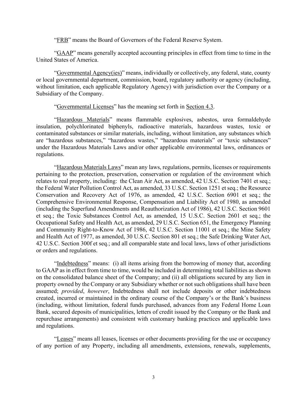 3 “FRB” means the Board of Governors of the Federal Reserve System. “GAAP” means generally accepted accounting principles in effect from time to time in the United States of America. “Governmental Agency(ies)” means, individually or collectively, any federal, state, county or local governmental department, commission, board, regulatory authority or agency (including, without limitation, each applicable Regulatory Agency) with jurisdiction over the Company or a Subsidiary of the Company. “Governmental Licenses” has the meaning set forth in Section 4.3. “Hazardous Materials” means flammable explosives, asbestos, urea formaldehyde insulation, polychlorinated biphenyls, radioactive materials, hazardous wastes, toxic or contaminated substances or similar materials, including, without limitation, any substances which are “hazardous substances,” “hazardous wastes,” “hazardous materials” or “toxic substances” under the Hazardous Materials Laws and/or other applicable environmental laws, ordinances or regulations. “Hazardous Materials Laws” mean any laws, regulations, permits, licenses or requirements pertaining to the protection, preservation, conservation or regulation of the environment which relates to real property, including: the Clean Air Act, as amended, 42 U.S.C. Section 7401 et seq.; the Federal Water Pollution Control Act, as amended, 33 U.S.C. Section 1251 et seq.; the Resource Conservation and Recovery Act of 1976, as amended, 42 U.S.C. Section 6901 et seq.; the Comprehensive Environmental Response, Compensation and Liability Act of 1980, as amended (including the Superfund Amendments and Reauthorization Act of 1986), 42 U.S.C. Section 9601 et seq.; the Toxic Substances Control Act, as amended, 15 U.S.C. Section 2601 et seq.; the Occupational Safety and Health Act, as amended, 29 U.S.C. Section 651, the Emergency Planning and Community Right-to-Know Act of 1986, 42 U.S.C. Section 11001 et seq.; the Mine Safety and Health Act of 1977, as amended, 30 U.S.C. Section 801 et seq.; the Safe Drinking Water Act, 42 U.S.C. Section 300f et seq.; and all comparable state and local laws, laws of other jurisdictions or orders and regulations. “Indebtedness” means: (i) all items arising from the borrowing of money that, according to GAAP as in effect from time to time, would be included in determining total liabilities as shown on the consolidated balance sheet of the Company; and (ii) all obligations secured by any lien in property owned by the Company or any Subsidiary whether or not such obligations shall have been assumed; provided, however, Indebtedness shall not include deposits or other indebtedness created, incurred or maintained in the ordinary course of the Company’s or the Bank’s business (including, without limitation, federal funds purchased, advances from any Federal Home Loan Bank, secured deposits of municipalities, letters of credit issued by the Company or the Bank and repurchase arrangements) and consistent with customary banking practices and applicable laws and regulations. “Leases” means all leases, licenses or other documents providing for the use or occupancy of any portion of any Property, including all amendments, extensions, renewals, supplements,