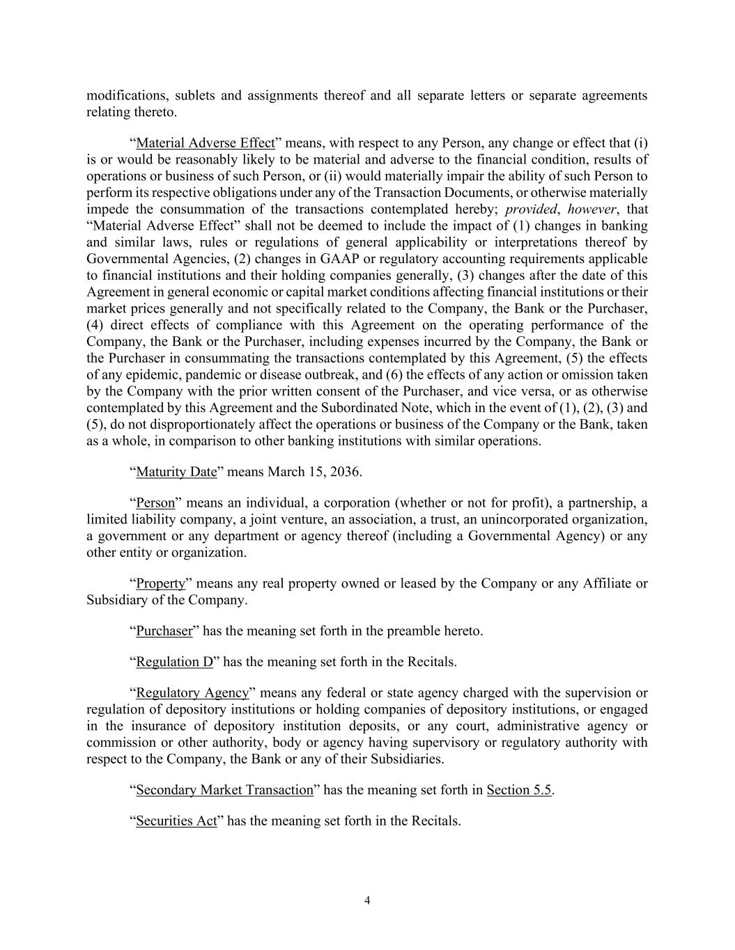 4 modifications, sublets and assignments thereof and all separate letters or separate agreements relating thereto. “Material Adverse Effect” means, with respect to any Person, any change or effect that (i) is or would be reasonably likely to be material and adverse to the financial condition, results of operations or business of such Person, or (ii) would materially impair the ability of such Person to perform its respective obligations under any of the Transaction Documents, or otherwise materially impede the consummation of the transactions contemplated hereby; provided, however, that “Material Adverse Effect” shall not be deemed to include the impact of (1) changes in banking and similar laws, rules or regulations of general applicability or interpretations thereof by Governmental Agencies, (2) changes in GAAP or regulatory accounting requirements applicable to financial institutions and their holding companies generally, (3) changes after the date of this Agreement in general economic or capital market conditions affecting financial institutions or their market prices generally and not specifically related to the Company, the Bank or the Purchaser, (4) direct effects of compliance with this Agreement on the operating performance of the Company, the Bank or the Purchaser, including expenses incurred by the Company, the Bank or the Purchaser in consummating the transactions contemplated by this Agreement, (5) the effects of any epidemic, pandemic or disease outbreak, and (6) the effects of any action or omission taken by the Company with the prior written consent of the Purchaser, and vice versa, or as otherwise contemplated by this Agreement and the Subordinated Note, which in the event of (1), (2), (3) and (5), do not disproportionately affect the operations or business of the Company or the Bank, taken as a whole, in comparison to other banking institutions with similar operations. “Maturity Date” means March 15, 2036. “Person” means an individual, a corporation (whether or not for profit), a partnership, a limited liability company, a joint venture, an association, a trust, an unincorporated organization, a government or any department or agency thereof (including a Governmental Agency) or any other entity or organization. “Property” means any real property owned or leased by the Company or any Affiliate or Subsidiary of the Company. “Purchaser” has the meaning set forth in the preamble hereto. “Regulation D” has the meaning set forth in the Recitals. “Regulatory Agency” means any federal or state agency charged with the supervision or regulation of depository institutions or holding companies of depository institutions, or engaged in the insurance of depository institution deposits, or any court, administrative agency or commission or other authority, body or agency having supervisory or regulatory authority with respect to the Company, the Bank or any of their Subsidiaries. “Secondary Market Transaction” has the meaning set forth in Section 5.5. “Securities Act” has the meaning set forth in the Recitals.