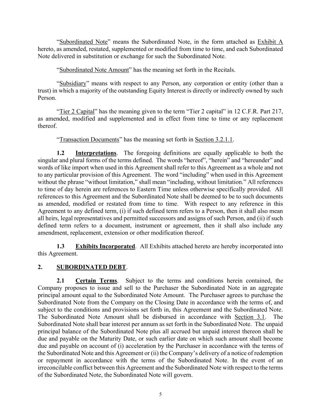 5 “Subordinated Note” means the Subordinated Note, in the form attached as Exhibit A hereto, as amended, restated, supplemented or modified from time to time, and each Subordinated Note delivered in substitution or exchange for such the Subordinated Note. “Subordinated Note Amount” has the meaning set forth in the Recitals. “Subsidiary” means with respect to any Person, any corporation or entity (other than a trust) in which a majority of the outstanding Equity Interest is directly or indirectly owned by such Person. “Tier 2 Capital” has the meaning given to the term “Tier 2 capital” in 12 C.F.R. Part 217, as amended, modified and supplemented and in effect from time to time or any replacement thereof. “Transaction Documents” has the meaning set forth in Section 3.2.1.1. 1.2 Interpretations. The foregoing definitions are equally applicable to both the singular and plural forms of the terms defined. The words “hereof”, “herein” and “hereunder” and words of like import when used in this Agreement shall refer to this Agreement as a whole and not to any particular provision of this Agreement. The word “including” when used in this Agreement without the phrase “without limitation,” shall mean “including, without limitation.” All references to time of day herein are references to Eastern Time unless otherwise specifically provided. All references to this Agreement and the Subordinated Note shall be deemed to be to such documents as amended, modified or restated from time to time. With respect to any reference in this Agreement to any defined term, (i) if such defined term refers to a Person, then it shall also mean all heirs, legal representatives and permitted successors and assigns of such Person, and (ii) if such defined term refers to a document, instrument or agreement, then it shall also include any amendment, replacement, extension or other modification thereof. 1.3 Exhibits Incorporated. All Exhibits attached hereto are hereby incorporated into this Agreement. 2. SUBORDINATED DEBT. 2.1 Certain Terms. Subject to the terms and conditions herein contained, the Company proposes to issue and sell to the Purchaser the Subordinated Note in an aggregate principal amount equal to the Subordinated Note Amount. The Purchaser agrees to purchase the Subordinated Note from the Company on the Closing Date in accordance with the terms of, and subject to the conditions and provisions set forth in, this Agreement and the Subordinated Note. The Subordinated Note Amount shall be disbursed in accordance with Section 3.1. The Subordinated Note shall bear interest per annum as set forth in the Subordinated Note. The unpaid principal balance of the Subordinated Note plus all accrued but unpaid interest thereon shall be due and payable on the Maturity Date, or such earlier date on which such amount shall become due and payable on account of (i) acceleration by the Purchaser in accordance with the terms of the Subordinated Note and this Agreement or (ii) the Company’s delivery of a notice of redemption or repayment in accordance with the terms of the Subordinated Note. In the event of an irreconcilable conflict between this Agreement and the Subordinated Note with respect to the terms of the Subordinated Note, the Subordinated Note will govern.