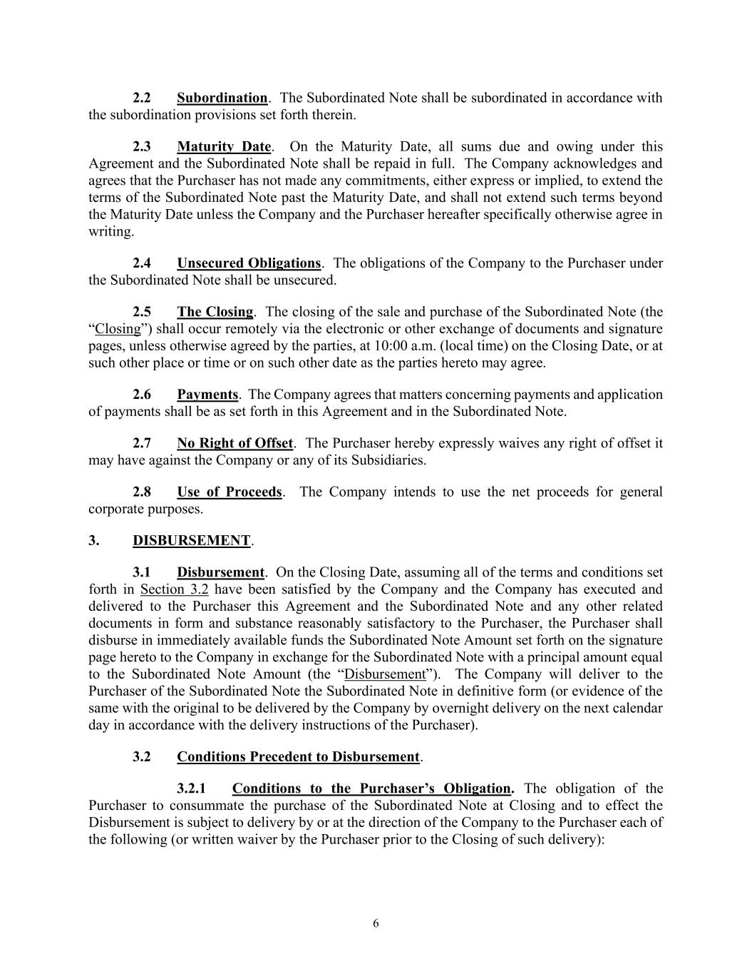 6 2.2 Subordination. The Subordinated Note shall be subordinated in accordance with the subordination provisions set forth therein. 2.3 Maturity Date. On the Maturity Date, all sums due and owing under this Agreement and the Subordinated Note shall be repaid in full. The Company acknowledges and agrees that the Purchaser has not made any commitments, either express or implied, to extend the terms of the Subordinated Note past the Maturity Date, and shall not extend such terms beyond the Maturity Date unless the Company and the Purchaser hereafter specifically otherwise agree in writing. 2.4 Unsecured Obligations. The obligations of the Company to the Purchaser under the Subordinated Note shall be unsecured. 2.5 The Closing. The closing of the sale and purchase of the Subordinated Note (the “Closing”) shall occur remotely via the electronic or other exchange of documents and signature pages, unless otherwise agreed by the parties, at 10:00 a.m. (local time) on the Closing Date, or at such other place or time or on such other date as the parties hereto may agree. 2.6 Payments. The Company agrees that matters concerning payments and application of payments shall be as set forth in this Agreement and in the Subordinated Note. 2.7 No Right of Offset. The Purchaser hereby expressly waives any right of offset it may have against the Company or any of its Subsidiaries. 2.8 Use of Proceeds. The Company intends to use the net proceeds for general corporate purposes. 3. DISBURSEMENT. 3.1 Disbursement. On the Closing Date, assuming all of the terms and conditions set forth in Section 3.2 have been satisfied by the Company and the Company has executed and delivered to the Purchaser this Agreement and the Subordinated Note and any other related documents in form and substance reasonably satisfactory to the Purchaser, the Purchaser shall disburse in immediately available funds the Subordinated Note Amount set forth on the signature page hereto to the Company in exchange for the Subordinated Note with a principal amount equal to the Subordinated Note Amount (the “Disbursement”). The Company will deliver to the Purchaser of the Subordinated Note the Subordinated Note in definitive form (or evidence of the same with the original to be delivered by the Company by overnight delivery on the next calendar day in accordance with the delivery instructions of the Purchaser). 3.2 Conditions Precedent to Disbursement. 3.2.1 Conditions to the Purchaser’s Obligation. The obligation of the Purchaser to consummate the purchase of the Subordinated Note at Closing and to effect the Disbursement is subject to delivery by or at the direction of the Company to the Purchaser each of the following (or written waiver by the Purchaser prior to the Closing of such delivery):