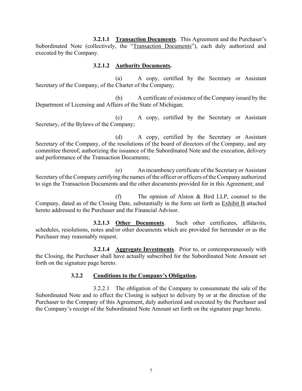 7 3.2.1.1 Transaction Documents. This Agreement and the Purchaser’s Subordinated Note (collectively, the “Transaction Documents”), each duly authorized and executed by the Company. 3.2.1.2 Authority Documents. (a) A copy, certified by the Secretary or Assistant Secretary of the Company, of the Charter of the Company; (b) A certificate of existence of the Company issued by the Department of Licensing and Affairs of the State of Michigan; (c) A copy, certified by the Secretary or Assistant Secretary, of the Bylaws of the Company; (d) A copy, certified by the Secretary or Assistant Secretary of the Company, of the resolutions of the board of directors of the Company, and any committee thereof, authorizing the issuance of the Subordinated Note and the execution, delivery and performance of the Transaction Documents; (e) An incumbency certificate of the Secretary or Assistant Secretary of the Company certifying the names of the officer or officers of the Company authorized to sign the Transaction Documents and the other documents provided for in this Agreement; and (f) The opinion of Alston & Bird LLP, counsel to the Company, dated as of the Closing Date, substantially in the form set forth as Exhibit B attached hereto addressed to the Purchaser and the Financial Advisor. 3.2.1.3 Other Documents. Such other certificates, affidavits, schedules, resolutions, notes and/or other documents which are provided for hereunder or as the Purchaser may reasonably request. 3.2.1.4 Aggregate Investments. Prior to, or contemporaneously with the Closing, the Purchaser shall have actually subscribed for the Subordinated Note Amount set forth on the signature page hereto. 3.2.2 Conditions to the Company’s Obligation. 3.2.2.1 The obligation of the Company to consummate the sale of the Subordinated Note and to effect the Closing is subject to delivery by or at the direction of the Purchaser to the Company of this Agreement, duly authorized and executed by the Purchaser and the Company’s receipt of the Subordinated Note Amount set forth on the signature page hereto.
