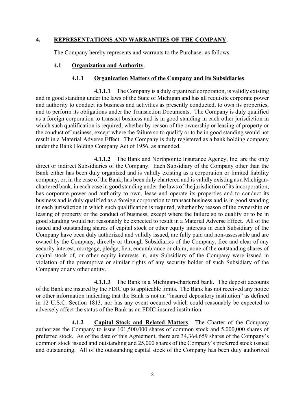 8 4. REPRESENTATIONS AND WARRANTIES OF THE COMPANY. The Company hereby represents and warrants to the Purchaser as follows: 4.1 Organization and Authority. 4.1.1 Organization Matters of the Company and Its Subsidiaries. 4.1.1.1 The Company is a duly organized corporation, is validly existing and in good standing under the laws of the State of Michigan and has all requisite corporate power and authority to conduct its business and activities as presently conducted, to own its properties, and to perform its obligations under the Transaction Documents. The Company is duly qualified as a foreign corporation to transact business and is in good standing in each other jurisdiction in which such qualification is required, whether by reason of the ownership or leasing of property or the conduct of business, except where the failure so to qualify or to be in good standing would not result in a Material Adverse Effect. The Company is duly registered as a bank holding company under the Bank Holding Company Act of 1956, as amended. 4.1.1.2 The Bank and Northpointe Insurance Agency, Inc. are the only direct or indirect Subsidiaries of the Company. Each Subsidiary of the Company other than the Bank either has been duly organized and is validly existing as a corporation or limited liability company, or, in the case of the Bank, has been duly chartered and is validly existing as a Michigan- chartered bank, in each case in good standing under the laws of the jurisdiction of its incorporation, has corporate power and authority to own, lease and operate its properties and to conduct its business and is duly qualified as a foreign corporation to transact business and is in good standing in each jurisdiction in which such qualification is required, whether by reason of the ownership or leasing of property or the conduct of business, except where the failure so to qualify or to be in good standing would not reasonably be expected to result in a Material Adverse Effect. All of the issued and outstanding shares of capital stock or other equity interests in each Subsidiary of the Company have been duly authorized and validly issued, are fully paid and non-assessable and are owned by the Company, directly or through Subsidiaries of the Company, free and clear of any security interest, mortgage, pledge, lien, encumbrance or claim; none of the outstanding shares of capital stock of, or other equity interests in, any Subsidiary of the Company were issued in violation of the preemptive or similar rights of any security holder of such Subsidiary of the Company or any other entity. 4.1.1.3 The Bank is a Michigan-chartered bank. The deposit accounts of the Bank are insured by the FDIC up to applicable limits. The Bank has not received any notice or other information indicating that the Bank is not an “insured depository institution” as defined in 12 U.S.C. Section 1813, nor has any event occurred which could reasonably be expected to adversely affect the status of the Bank as an FDIC-insured institution. 4.1.2 Capital Stock and Related Matters. The Charter of the Company authorizes the Company to issue 101,500,000 shares of common stock and 5,000,000 shares of preferred stock. As of the date of this Agreement, there are 34,364,659 shares of the Company’s common stock issued and outstanding and 25,000 shares of the Company’s preferred stock issued and outstanding. All of the outstanding capital stock of the Company has been duly authorized