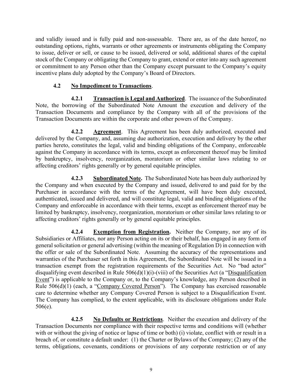 9 and validly issued and is fully paid and non-assessable. There are, as of the date hereof, no outstanding options, rights, warrants or other agreements or instruments obligating the Company to issue, deliver or sell, or cause to be issued, delivered or sold, additional shares of the capital stock of the Company or obligating the Company to grant, extend or enter into any such agreement or commitment to any Person other than the Company except pursuant to the Company’s equity incentive plans duly adopted by the Company’s Board of Directors. 4.2 No Impediment to Transactions. 4.2.1 Transaction is Legal and Authorized. The issuance of the Subordinated Note, the borrowing of the Subordinated Note Amount the execution and delivery of the Transaction Documents and compliance by the Company with all of the provisions of the Transaction Documents are within the corporate and other powers of the Company. 4.2.2 Agreement. This Agreement has been duly authorized, executed and delivered by the Company, and, assuming due authorization, execution and delivery by the other parties hereto, constitutes the legal, valid and binding obligations of the Company, enforceable against the Company in accordance with its terms, except as enforcement thereof may be limited by bankruptcy, insolvency, reorganization, moratorium or other similar laws relating to or affecting creditors’ rights generally or by general equitable principles. 4.2.3 Subordinated Note. The Subordinated Note has been duly authorized by the Company and when executed by the Company and issued, delivered to and paid for by the Purchaser in accordance with the terms of the Agreement, will have been duly executed, authenticated, issued and delivered, and will constitute legal, valid and binding obligations of the Company and enforceable in accordance with their terms, except as enforcement thereof may be limited by bankruptcy, insolvency, reorganization, moratorium or other similar laws relating to or affecting creditors’ rights generally or by general equitable principles. 4.2.4 Exemption from Registration. Neither the Company, nor any of its Subsidiaries or Affiliates, nor any Person acting on its or their behalf, has engaged in any form of general solicitation or general advertising (within the meaning of Regulation D) in connection with the offer or sale of the Subordinated Note. Assuming the accuracy of the representations and warranties of the Purchaser set forth in this Agreement, the Subordinated Note will be issued in a transaction exempt from the registration requirements of the Securities Act. No “bad actor” disqualifying event described in Rule 506(d)(1)(i)-(viii) of the Securities Act (a “Disqualification Event”) is applicable to the Company or, to the Company’s knowledge, any Person described in Rule 506(d)(1) (each, a “Company Covered Person”). The Company has exercised reasonable care to determine whether any Company Covered Person is subject to a Disqualification Event. The Company has complied, to the extent applicable, with its disclosure obligations under Rule 506(e). 4.2.5 No Defaults or Restrictions. Neither the execution and delivery of the Transaction Documents nor compliance with their respective terms and conditions will (whether with or without the giving of notice or lapse of time or both) (i) violate, conflict with or result in a breach of, or constitute a default under: (1) the Charter or Bylaws of the Company; (2) any of the terms, obligations, covenants, conditions or provisions of any corporate restriction or of any
