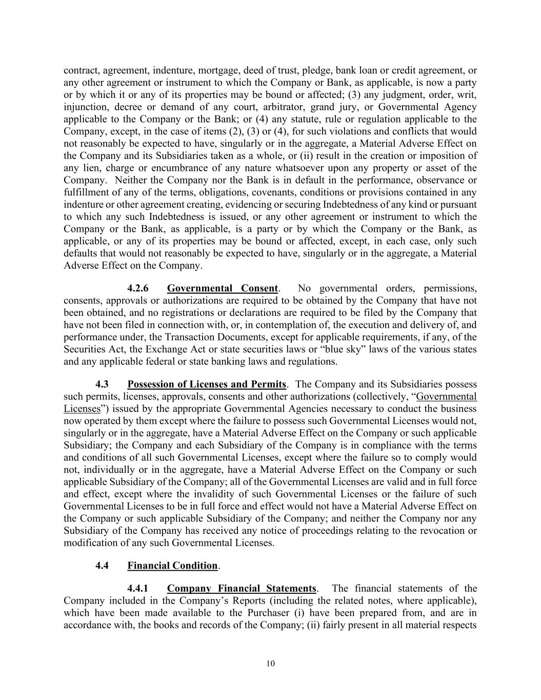 10 contract, agreement, indenture, mortgage, deed of trust, pledge, bank loan or credit agreement, or any other agreement or instrument to which the Company or Bank, as applicable, is now a party or by which it or any of its properties may be bound or affected; (3) any judgment, order, writ, injunction, decree or demand of any court, arbitrator, grand jury, or Governmental Agency applicable to the Company or the Bank; or (4) any statute, rule or regulation applicable to the Company, except, in the case of items (2), (3) or (4), for such violations and conflicts that would not reasonably be expected to have, singularly or in the aggregate, a Material Adverse Effect on the Company and its Subsidiaries taken as a whole, or (ii) result in the creation or imposition of any lien, charge or encumbrance of any nature whatsoever upon any property or asset of the Company. Neither the Company nor the Bank is in default in the performance, observance or fulfillment of any of the terms, obligations, covenants, conditions or provisions contained in any indenture or other agreement creating, evidencing or securing Indebtedness of any kind or pursuant to which any such Indebtedness is issued, or any other agreement or instrument to which the Company or the Bank, as applicable, is a party or by which the Company or the Bank, as applicable, or any of its properties may be bound or affected, except, in each case, only such defaults that would not reasonably be expected to have, singularly or in the aggregate, a Material Adverse Effect on the Company. 4.2.6 Governmental Consent. No governmental orders, permissions, consents, approvals or authorizations are required to be obtained by the Company that have not been obtained, and no registrations or declarations are required to be filed by the Company that have not been filed in connection with, or, in contemplation of, the execution and delivery of, and performance under, the Transaction Documents, except for applicable requirements, if any, of the Securities Act, the Exchange Act or state securities laws or “blue sky” laws of the various states and any applicable federal or state banking laws and regulations. 4.3 Possession of Licenses and Permits. The Company and its Subsidiaries possess such permits, licenses, approvals, consents and other authorizations (collectively, “Governmental Licenses”) issued by the appropriate Governmental Agencies necessary to conduct the business now operated by them except where the failure to possess such Governmental Licenses would not, singularly or in the aggregate, have a Material Adverse Effect on the Company or such applicable Subsidiary; the Company and each Subsidiary of the Company is in compliance with the terms and conditions of all such Governmental Licenses, except where the failure so to comply would not, individually or in the aggregate, have a Material Adverse Effect on the Company or such applicable Subsidiary of the Company; all of the Governmental Licenses are valid and in full force and effect, except where the invalidity of such Governmental Licenses or the failure of such Governmental Licenses to be in full force and effect would not have a Material Adverse Effect on the Company or such applicable Subsidiary of the Company; and neither the Company nor any Subsidiary of the Company has received any notice of proceedings relating to the revocation or modification of any such Governmental Licenses. 4.4 Financial Condition. 4.4.1 Company Financial Statements. The financial statements of the Company included in the Company’s Reports (including the related notes, where applicable), which have been made available to the Purchaser (i) have been prepared from, and are in accordance with, the books and records of the Company; (ii) fairly present in all material respects