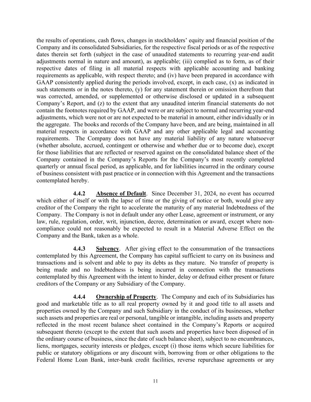 11 the results of operations, cash flows, changes in stockholders’ equity and financial position of the Company and its consolidated Subsidiaries, for the respective fiscal periods or as of the respective dates therein set forth (subject in the case of unaudited statements to recurring year-end audit adjustments normal in nature and amount), as applicable; (iii) complied as to form, as of their respective dates of filing in all material respects with applicable accounting and banking requirements as applicable, with respect thereto; and (iv) have been prepared in accordance with GAAP consistently applied during the periods involved, except, in each case, (x) as indicated in such statements or in the notes thereto, (y) for any statement therein or omission therefrom that was corrected, amended, or supplemented or otherwise disclosed or updated in a subsequent Company’s Report, and (z) to the extent that any unaudited interim financial statements do not contain the footnotes required by GAAP, and were or are subject to normal and recurring year-end adjustments, which were not or are not expected to be material in amount, either individually or in the aggregate. The books and records of the Company have been, and are being, maintained in all material respects in accordance with GAAP and any other applicable legal and accounting requirements. The Company does not have any material liability of any nature whatsoever (whether absolute, accrued, contingent or otherwise and whether due or to become due), except for those liabilities that are reflected or reserved against on the consolidated balance sheet of the Company contained in the Company’s Reports for the Company’s most recently completed quarterly or annual fiscal period, as applicable, and for liabilities incurred in the ordinary course of business consistent with past practice or in connection with this Agreement and the transactions contemplated hereby. 4.4.2 Absence of Default. Since December 31, 2024, no event has occurred which either of itself or with the lapse of time or the giving of notice or both, would give any creditor of the Company the right to accelerate the maturity of any material Indebtedness of the Company. The Company is not in default under any other Lease, agreement or instrument, or any law, rule, regulation, order, writ, injunction, decree, determination or award, except where non- compliance could not reasonably be expected to result in a Material Adverse Effect on the Company and the Bank, taken as a whole. 4.4.3 Solvency. After giving effect to the consummation of the transactions contemplated by this Agreement, the Company has capital sufficient to carry on its business and transactions and is solvent and able to pay its debts as they mature. No transfer of property is being made and no Indebtedness is being incurred in connection with the transactions contemplated by this Agreement with the intent to hinder, delay or defraud either present or future creditors of the Company or any Subsidiary of the Company. 4.4.4 Ownership of Property. The Company and each of its Subsidiaries has good and marketable title as to all real property owned by it and good title to all assets and properties owned by the Company and such Subsidiary in the conduct of its businesses, whether such assets and properties are real or personal, tangible or intangible, including assets and property reflected in the most recent balance sheet contained in the Company’s Reports or acquired subsequent thereto (except to the extent that such assets and properties have been disposed of in the ordinary course of business, since the date of such balance sheet), subject to no encumbrances, liens, mortgages, security interests or pledges, except (i) those items which secure liabilities for public or statutory obligations or any discount with, borrowing from or other obligations to the Federal Home Loan Bank, inter-bank credit facilities, reverse repurchase agreements or any