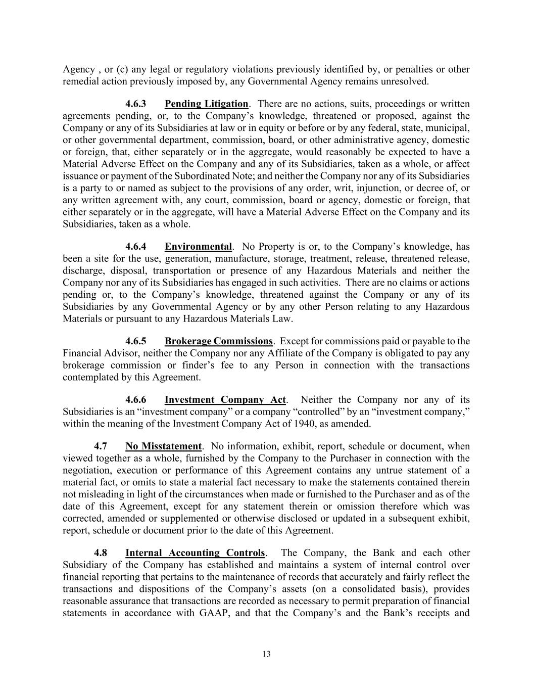 13 Agency , or (c) any legal or regulatory violations previously identified by, or penalties or other remedial action previously imposed by, any Governmental Agency remains unresolved. 4.6.3 Pending Litigation. There are no actions, suits, proceedings or written agreements pending, or, to the Company’s knowledge, threatened or proposed, against the Company or any of its Subsidiaries at law or in equity or before or by any federal, state, municipal, or other governmental department, commission, board, or other administrative agency, domestic or foreign, that, either separately or in the aggregate, would reasonably be expected to have a Material Adverse Effect on the Company and any of its Subsidiaries, taken as a whole, or affect issuance or payment of the Subordinated Note; and neither the Company nor any of its Subsidiaries is a party to or named as subject to the provisions of any order, writ, injunction, or decree of, or any written agreement with, any court, commission, board or agency, domestic or foreign, that either separately or in the aggregate, will have a Material Adverse Effect on the Company and its Subsidiaries, taken as a whole. 4.6.4 Environmental. No Property is or, to the Company’s knowledge, has been a site for the use, generation, manufacture, storage, treatment, release, threatened release, discharge, disposal, transportation or presence of any Hazardous Materials and neither the Company nor any of its Subsidiaries has engaged in such activities. There are no claims or actions pending or, to the Company’s knowledge, threatened against the Company or any of its Subsidiaries by any Governmental Agency or by any other Person relating to any Hazardous Materials or pursuant to any Hazardous Materials Law. 4.6.5 Brokerage Commissions. Except for commissions paid or payable to the Financial Advisor, neither the Company nor any Affiliate of the Company is obligated to pay any brokerage commission or finder’s fee to any Person in connection with the transactions contemplated by this Agreement. 4.6.6 Investment Company Act. Neither the Company nor any of its Subsidiaries is an “investment company” or a company “controlled” by an “investment company,” within the meaning of the Investment Company Act of 1940, as amended. 4.7 No Misstatement. No information, exhibit, report, schedule or document, when viewed together as a whole, furnished by the Company to the Purchaser in connection with the negotiation, execution or performance of this Agreement contains any untrue statement of a material fact, or omits to state a material fact necessary to make the statements contained therein not misleading in light of the circumstances when made or furnished to the Purchaser and as of the date of this Agreement, except for any statement therein or omission therefore which was corrected, amended or supplemented or otherwise disclosed or updated in a subsequent exhibit, report, schedule or document prior to the date of this Agreement. 4.8 Internal Accounting Controls. The Company, the Bank and each other Subsidiary of the Company has established and maintains a system of internal control over financial reporting that pertains to the maintenance of records that accurately and fairly reflect the transactions and dispositions of the Company’s assets (on a consolidated basis), provides reasonable assurance that transactions are recorded as necessary to permit preparation of financial statements in accordance with GAAP, and that the Company’s and the Bank’s receipts and