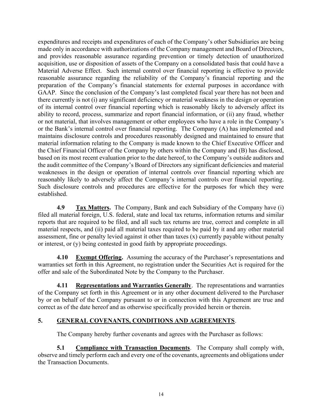 14 expenditures and receipts and expenditures of each of the Company’s other Subsidiaries are being made only in accordance with authorizations of the Company management and Board of Directors, and provides reasonable assurance regarding prevention or timely detection of unauthorized acquisition, use or disposition of assets of the Company on a consolidated basis that could have a Material Adverse Effect. Such internal control over financial reporting is effective to provide reasonable assurance regarding the reliability of the Company’s financial reporting and the preparation of the Company’s financial statements for external purposes in accordance with GAAP. Since the conclusion of the Company’s last completed fiscal year there has not been and there currently is not (i) any significant deficiency or material weakness in the design or operation of its internal control over financial reporting which is reasonably likely to adversely affect its ability to record, process, summarize and report financial information, or (ii) any fraud, whether or not material, that involves management or other employees who have a role in the Company’s or the Bank’s internal control over financial reporting. The Company (A) has implemented and maintains disclosure controls and procedures reasonably designed and maintained to ensure that material information relating to the Company is made known to the Chief Executive Officer and the Chief Financial Officer of the Company by others within the Company and (B) has disclosed, based on its most recent evaluation prior to the date hereof, to the Company’s outside auditors and the audit committee of the Company’s Board of Directors any significant deficiencies and material weaknesses in the design or operation of internal controls over financial reporting which are reasonably likely to adversely affect the Company’s internal controls over financial reporting. Such disclosure controls and procedures are effective for the purposes for which they were established. 4.9 Tax Matters. The Company, Bank and each Subsidiary of the Company have (i) filed all material foreign, U.S. federal, state and local tax returns, information returns and similar reports that are required to be filed, and all such tax returns are true, correct and complete in all material respects, and (ii) paid all material taxes required to be paid by it and any other material assessment, fine or penalty levied against it other than taxes (x) currently payable without penalty or interest, or (y) being contested in good faith by appropriate proceedings. 4.10 Exempt Offering. Assuming the accuracy of the Purchaser’s representations and warranties set forth in this Agreement, no registration under the Securities Act is required for the offer and sale of the Subordinated Note by the Company to the Purchaser. 4.11 Representations and Warranties Generally. The representations and warranties of the Company set forth in this Agreement or in any other document delivered to the Purchaser by or on behalf of the Company pursuant to or in connection with this Agreement are true and correct as of the date hereof and as otherwise specifically provided herein or therein. 5. GENERAL COVENANTS, CONDITIONS AND AGREEMENTS. The Company hereby further covenants and agrees with the Purchaser as follows: 5.1 Compliance with Transaction Documents. The Company shall comply with, observe and timely perform each and every one of the covenants, agreements and obligations under the Transaction Documents.
