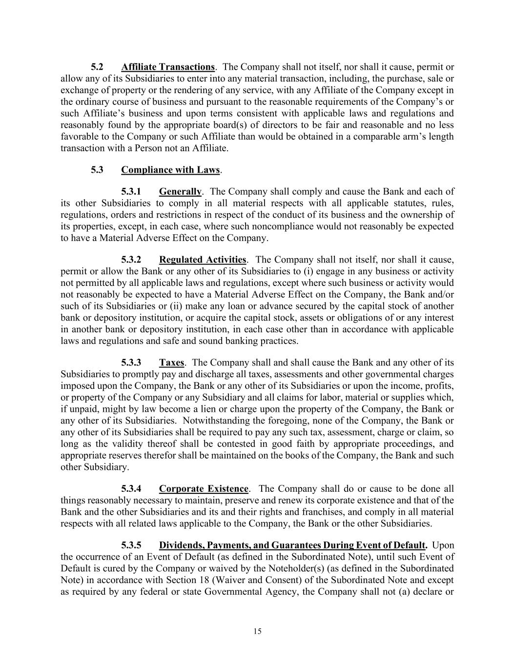 15 5.2 Affiliate Transactions. The Company shall not itself, nor shall it cause, permit or allow any of its Subsidiaries to enter into any material transaction, including, the purchase, sale or exchange of property or the rendering of any service, with any Affiliate of the Company except in the ordinary course of business and pursuant to the reasonable requirements of the Company’s or such Affiliate’s business and upon terms consistent with applicable laws and regulations and reasonably found by the appropriate board(s) of directors to be fair and reasonable and no less favorable to the Company or such Affiliate than would be obtained in a comparable arm’s length transaction with a Person not an Affiliate. 5.3 Compliance with Laws. 5.3.1 Generally. The Company shall comply and cause the Bank and each of its other Subsidiaries to comply in all material respects with all applicable statutes, rules, regulations, orders and restrictions in respect of the conduct of its business and the ownership of its properties, except, in each case, where such noncompliance would not reasonably be expected to have a Material Adverse Effect on the Company. 5.3.2 Regulated Activities. The Company shall not itself, nor shall it cause, permit or allow the Bank or any other of its Subsidiaries to (i) engage in any business or activity not permitted by all applicable laws and regulations, except where such business or activity would not reasonably be expected to have a Material Adverse Effect on the Company, the Bank and/or such of its Subsidiaries or (ii) make any loan or advance secured by the capital stock of another bank or depository institution, or acquire the capital stock, assets or obligations of or any interest in another bank or depository institution, in each case other than in accordance with applicable laws and regulations and safe and sound banking practices. 5.3.3 Taxes. The Company shall and shall cause the Bank and any other of its Subsidiaries to promptly pay and discharge all taxes, assessments and other governmental charges imposed upon the Company, the Bank or any other of its Subsidiaries or upon the income, profits, or property of the Company or any Subsidiary and all claims for labor, material or supplies which, if unpaid, might by law become a lien or charge upon the property of the Company, the Bank or any other of its Subsidiaries. Notwithstanding the foregoing, none of the Company, the Bank or any other of its Subsidiaries shall be required to pay any such tax, assessment, charge or claim, so long as the validity thereof shall be contested in good faith by appropriate proceedings, and appropriate reserves therefor shall be maintained on the books of the Company, the Bank and such other Subsidiary. 5.3.4 Corporate Existence. The Company shall do or cause to be done all things reasonably necessary to maintain, preserve and renew its corporate existence and that of the Bank and the other Subsidiaries and its and their rights and franchises, and comply in all material respects with all related laws applicable to the Company, the Bank or the other Subsidiaries. 5.3.5 Dividends, Payments, and Guarantees During Event of Default. Upon the occurrence of an Event of Default (as defined in the Subordinated Note), until such Event of Default is cured by the Company or waived by the Noteholder(s) (as defined in the Subordinated Note) in accordance with Section 18 (Waiver and Consent) of the Subordinated Note and except as required by any federal or state Governmental Agency, the Company shall not (a) declare or