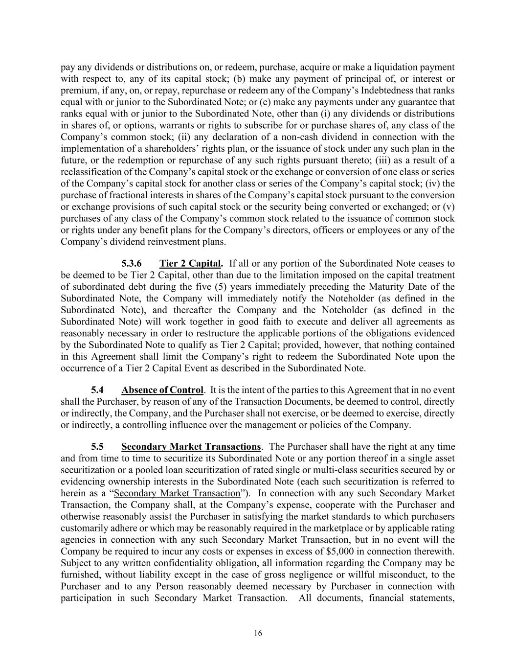16 pay any dividends or distributions on, or redeem, purchase, acquire or make a liquidation payment with respect to, any of its capital stock; (b) make any payment of principal of, or interest or premium, if any, on, or repay, repurchase or redeem any of the Company’s Indebtedness that ranks equal with or junior to the Subordinated Note; or (c) make any payments under any guarantee that ranks equal with or junior to the Subordinated Note, other than (i) any dividends or distributions in shares of, or options, warrants or rights to subscribe for or purchase shares of, any class of the Company’s common stock; (ii) any declaration of a non-cash dividend in connection with the implementation of a shareholders’ rights plan, or the issuance of stock under any such plan in the future, or the redemption or repurchase of any such rights pursuant thereto; (iii) as a result of a reclassification of the Company’s capital stock or the exchange or conversion of one class or series of the Company’s capital stock for another class or series of the Company’s capital stock; (iv) the purchase of fractional interests in shares of the Company’s capital stock pursuant to the conversion or exchange provisions of such capital stock or the security being converted or exchanged; or (v) purchases of any class of the Company’s common stock related to the issuance of common stock or rights under any benefit plans for the Company’s directors, officers or employees or any of the Company’s dividend reinvestment plans. 5.3.6 Tier 2 Capital. If all or any portion of the Subordinated Note ceases to be deemed to be Tier 2 Capital, other than due to the limitation imposed on the capital treatment of subordinated debt during the five (5) years immediately preceding the Maturity Date of the Subordinated Note, the Company will immediately notify the Noteholder (as defined in the Subordinated Note), and thereafter the Company and the Noteholder (as defined in the Subordinated Note) will work together in good faith to execute and deliver all agreements as reasonably necessary in order to restructure the applicable portions of the obligations evidenced by the Subordinated Note to qualify as Tier 2 Capital; provided, however, that nothing contained in this Agreement shall limit the Company’s right to redeem the Subordinated Note upon the occurrence of a Tier 2 Capital Event as described in the Subordinated Note. 5.4 Absence of Control. It is the intent of the parties to this Agreement that in no event shall the Purchaser, by reason of any of the Transaction Documents, be deemed to control, directly or indirectly, the Company, and the Purchaser shall not exercise, or be deemed to exercise, directly or indirectly, a controlling influence over the management or policies of the Company. 5.5 Secondary Market Transactions. The Purchaser shall have the right at any time and from time to time to securitize its Subordinated Note or any portion thereof in a single asset securitization or a pooled loan securitization of rated single or multi-class securities secured by or evidencing ownership interests in the Subordinated Note (each such securitization is referred to herein as a “Secondary Market Transaction”). In connection with any such Secondary Market Transaction, the Company shall, at the Company’s expense, cooperate with the Purchaser and otherwise reasonably assist the Purchaser in satisfying the market standards to which purchasers customarily adhere or which may be reasonably required in the marketplace or by applicable rating agencies in connection with any such Secondary Market Transaction, but in no event will the Company be required to incur any costs or expenses in excess of $5,000 in connection therewith. Subject to any written confidentiality obligation, all information regarding the Company may be furnished, without liability except in the case of gross negligence or willful misconduct, to the Purchaser and to any Person reasonably deemed necessary by Purchaser in connection with participation in such Secondary Market Transaction. All documents, financial statements,