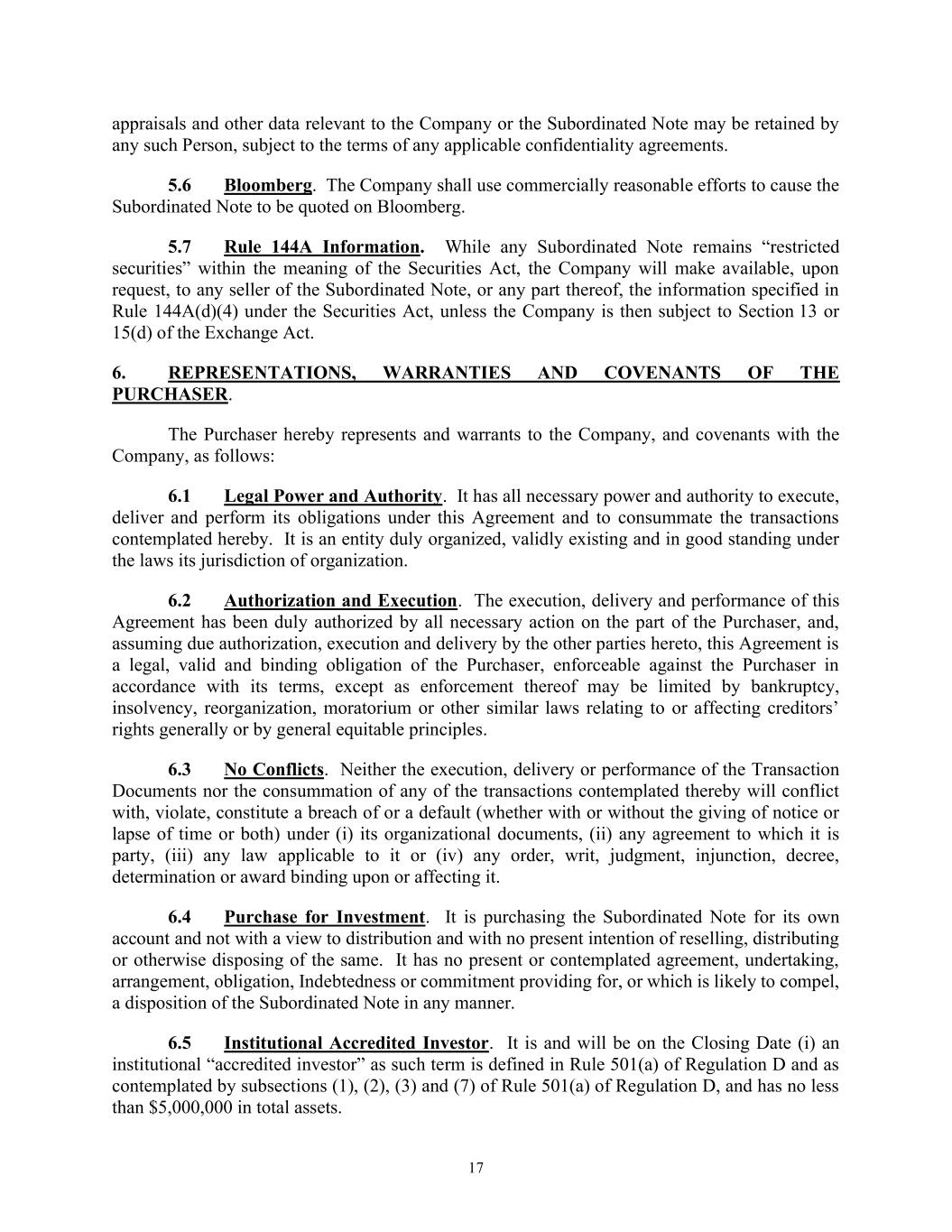 17 appraisals and other data relevant to the Company or the Subordinated Note may be retained by any such Person, subject to the terms of any applicable confidentiality agreements. 5.6 Bloomberg. The Company shall use commercially reasonable efforts to cause the Subordinated Note to be quoted on Bloomberg. 5.7 Rule 144A Information. While any Subordinated Note remains “restricted securities” within the meaning of the Securities Act, the Company will make available, upon request, to any seller of the Subordinated Note, or any part thereof, the information specified in Rule 144A(d)(4) under the Securities Act, unless the Company is then subject to Section 13 or 15(d) of the Exchange Act. 6. REPRESENTATIONS, WARRANTIES AND COVENANTS OF THE PURCHASER. The Purchaser hereby represents and warrants to the Company, and covenants with the Company, as follows: 6.1 Legal Power and Authority. It has all necessary power and authority to execute, deliver and perform its obligations under this Agreement and to consummate the transactions contemplated hereby. It is an entity duly organized, validly existing and in good standing under the laws its jurisdiction of organization. 6.2 Authorization and Execution. The execution, delivery and performance of this Agreement has been duly authorized by all necessary action on the part of the Purchaser, and, assuming due authorization, execution and delivery by the other parties hereto, this Agreement is a legal, valid and binding obligation of the Purchaser, enforceable against the Purchaser in accordance with its terms, except as enforcement thereof may be limited by bankruptcy, insolvency, reorganization, moratorium or other similar laws relating to or affecting creditors’ rights generally or by general equitable principles. 6.3 No Conflicts. Neither the execution, delivery or performance of the Transaction Documents nor the consummation of any of the transactions contemplated thereby will conflict with, violate, constitute a breach of or a default (whether with or without the giving of notice or lapse of time or both) under (i) its organizational documents, (ii) any agreement to which it is party, (iii) any law applicable to it or (iv) any order, writ, judgment, injunction, decree, determination or award binding upon or affecting it. 6.4 Purchase for Investment. It is purchasing the Subordinated Note for its own account and not with a view to distribution and with no present intention of reselling, distributing or otherwise disposing of the same. It has no present or contemplated agreement, undertaking, arrangement, obligation, Indebtedness or commitment providing for, or which is likely to compel, a disposition of the Subordinated Note in any manner. 6.5 Institutional Accredited Investor. It is and will be on the Closing Date (i) an institutional “accredited investor” as such term is defined in Rule 501(a) of Regulation D and as contemplated by subsections (1), (2), (3) and (7) of Rule 501(a) of Regulation D, and has no less than $5,000,000 in total assets.