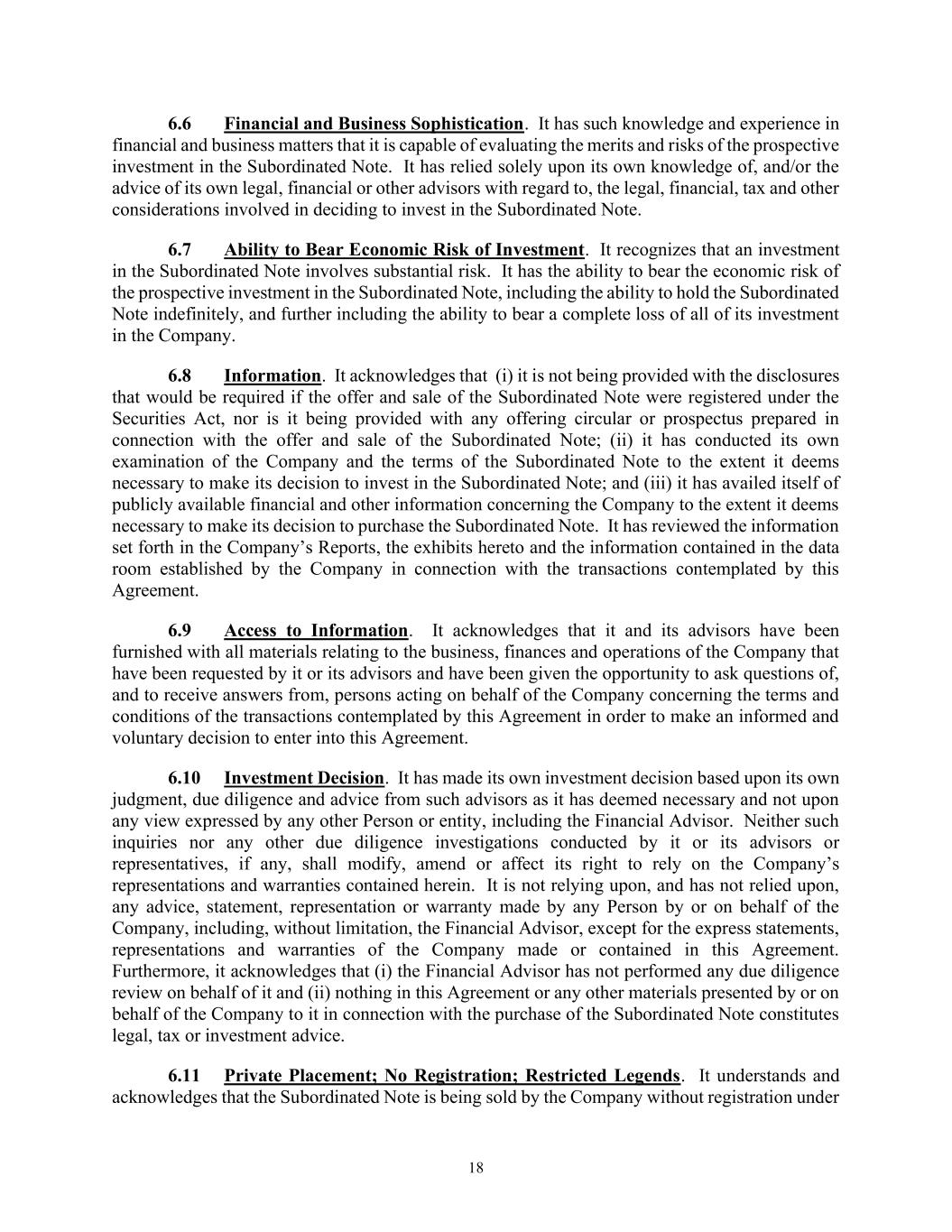 18 6.6 Financial and Business Sophistication. It has such knowledge and experience in financial and business matters that it is capable of evaluating the merits and risks of the prospective investment in the Subordinated Note. It has relied solely upon its own knowledge of, and/or the advice of its own legal, financial or other advisors with regard to, the legal, financial, tax and other considerations involved in deciding to invest in the Subordinated Note. 6.7 Ability to Bear Economic Risk of Investment. It recognizes that an investment in the Subordinated Note involves substantial risk. It has the ability to bear the economic risk of the prospective investment in the Subordinated Note, including the ability to hold the Subordinated Note indefinitely, and further including the ability to bear a complete loss of all of its investment in the Company. 6.8 Information. It acknowledges that (i) it is not being provided with the disclosures that would be required if the offer and sale of the Subordinated Note were registered under the Securities Act, nor is it being provided with any offering circular or prospectus prepared in connection with the offer and sale of the Subordinated Note; (ii) it has conducted its own examination of the Company and the terms of the Subordinated Note to the extent it deems necessary to make its decision to invest in the Subordinated Note; and (iii) it has availed itself of publicly available financial and other information concerning the Company to the extent it deems necessary to make its decision to purchase the Subordinated Note. It has reviewed the information set forth in the Company’s Reports, the exhibits hereto and the information contained in the data room established by the Company in connection with the transactions contemplated by this Agreement. 6.9 Access to Information. It acknowledges that it and its advisors have been furnished with all materials relating to the business, finances and operations of the Company that have been requested by it or its advisors and have been given the opportunity to ask questions of, and to receive answers from, persons acting on behalf of the Company concerning the terms and conditions of the transactions contemplated by this Agreement in order to make an informed and voluntary decision to enter into this Agreement. 6.10 Investment Decision. It has made its own investment decision based upon its own judgment, due diligence and advice from such advisors as it has deemed necessary and not upon any view expressed by any other Person or entity, including the Financial Advisor. Neither such inquiries nor any other due diligence investigations conducted by it or its advisors or representatives, if any, shall modify, amend or affect its right to rely on the Company’s representations and warranties contained herein. It is not relying upon, and has not relied upon, any advice, statement, representation or warranty made by any Person by or on behalf of the Company, including, without limitation, the Financial Advisor, except for the express statements, representations and warranties of the Company made or contained in this Agreement. Furthermore, it acknowledges that (i) the Financial Advisor has not performed any due diligence review on behalf of it and (ii) nothing in this Agreement or any other materials presented by or on behalf of the Company to it in connection with the purchase of the Subordinated Note constitutes legal, tax or investment advice. 6.11 Private Placement; No Registration; Restricted Legends. It understands and acknowledges that the Subordinated Note is being sold by the Company without registration under