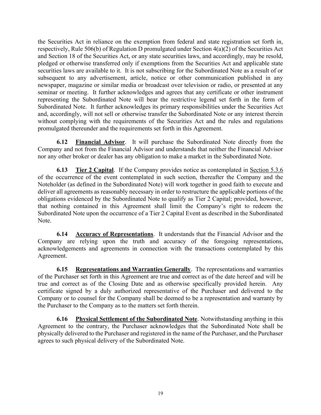 19 the Securities Act in reliance on the exemption from federal and state registration set forth in, respectively, Rule 506(b) of Regulation D promulgated under Section 4(a)(2) of the Securities Act and Section 18 of the Securities Act, or any state securities laws, and accordingly, may be resold, pledged or otherwise transferred only if exemptions from the Securities Act and applicable state securities laws are available to it. It is not subscribing for the Subordinated Note as a result of or subsequent to any advertisement, article, notice or other communication published in any newspaper, magazine or similar media or broadcast over television or radio, or presented at any seminar or meeting. It further acknowledges and agrees that any certificate or other instrument representing the Subordinated Note will bear the restrictive legend set forth in the form of Subordinated Note. It further acknowledges its primary responsibilities under the Securities Act and, accordingly, will not sell or otherwise transfer the Subordinated Note or any interest therein without complying with the requirements of the Securities Act and the rules and regulations promulgated thereunder and the requirements set forth in this Agreement. 6.12 Financial Advisor. It will purchase the Subordinated Note directly from the Company and not from the Financial Advisor and understands that neither the Financial Advisor nor any other broker or dealer has any obligation to make a market in the Subordinated Note. 6.13 Tier 2 Capital. If the Company provides notice as contemplated in Section 5.3.6 of the occurrence of the event contemplated in such section, thereafter the Company and the Noteholder (as defined in the Subordinated Note) will work together in good faith to execute and deliver all agreements as reasonably necessary in order to restructure the applicable portions of the obligations evidenced by the Subordinated Note to qualify as Tier 2 Capital; provided, however, that nothing contained in this Agreement shall limit the Company’s right to redeem the Subordinated Note upon the occurrence of a Tier 2 Capital Event as described in the Subordinated Note. 6.14 Accuracy of Representations. It understands that the Financial Advisor and the Company are relying upon the truth and accuracy of the foregoing representations, acknowledgements and agreements in connection with the transactions contemplated by this Agreement. 6.15 Representations and Warranties Generally. The representations and warranties of the Purchaser set forth in this Agreement are true and correct as of the date hereof and will be true and correct as of the Closing Date and as otherwise specifically provided herein. Any certificate signed by a duly authorized representative of the Purchaser and delivered to the Company or to counsel for the Company shall be deemed to be a representation and warranty by the Purchaser to the Company as to the matters set forth therein. 6.16 Physical Settlement of the Subordinated Note. Notwithstanding anything in this Agreement to the contrary, the Purchaser acknowledges that the Subordinated Note shall be physically delivered to the Purchaser and registered in the name of the Purchaser, and the Purchaser agrees to such physical delivery of the Subordinated Note.