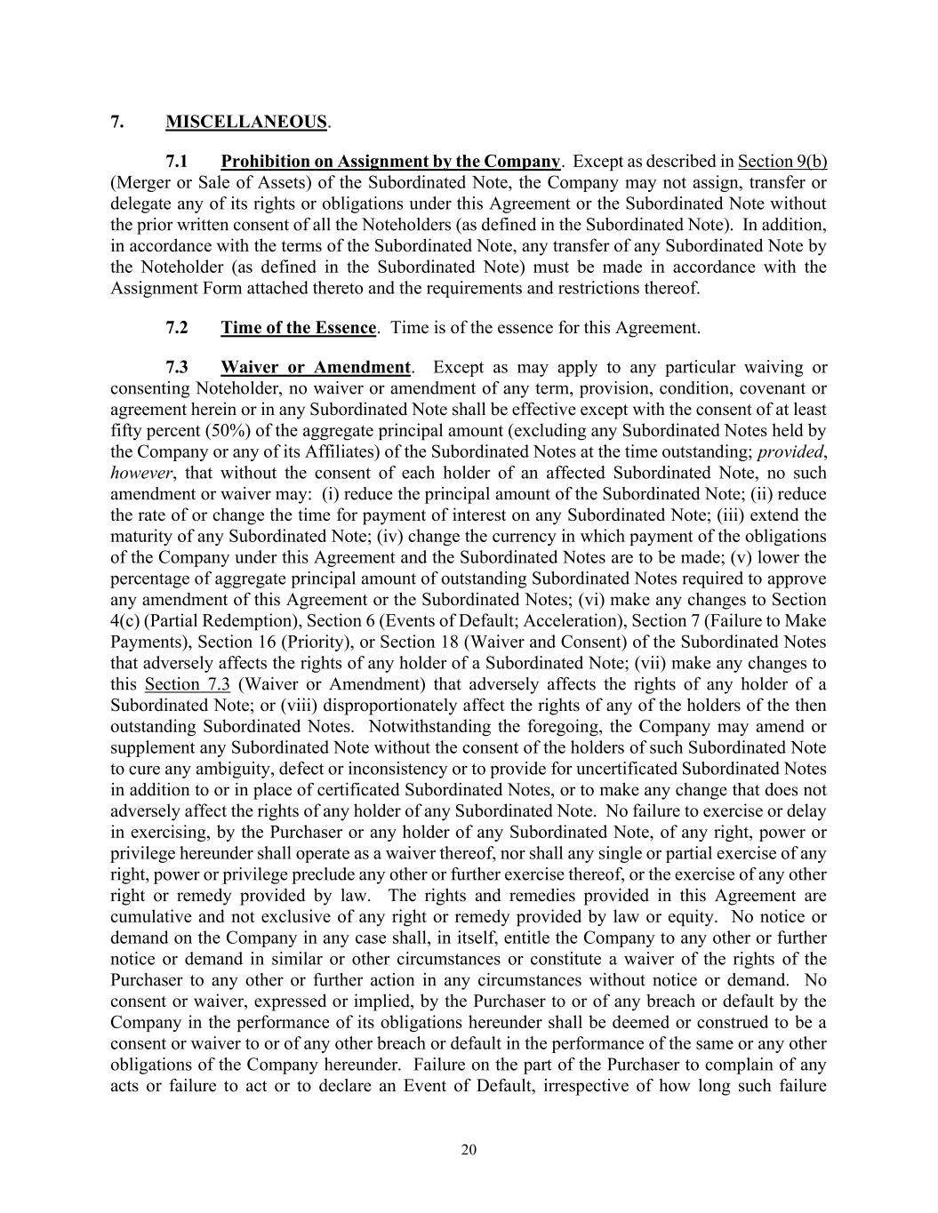 20 7. MISCELLANEOUS. 7.1 Prohibition on Assignment by the Company. Except as described in Section 9(b) (Merger or Sale of Assets) of the Subordinated Note, the Company may not assign, transfer or delegate any of its rights or obligations under this Agreement or the Subordinated Note without the prior written consent of all the Noteholders (as defined in the Subordinated Note). In addition, in accordance with the terms of the Subordinated Note, any transfer of any Subordinated Note by the Noteholder (as defined in the Subordinated Note) must be made in accordance with the Assignment Form attached thereto and the requirements and restrictions thereof. 7.2 Time of the Essence. Time is of the essence for this Agreement. 7.3 Waiver or Amendment. Except as may apply to any particular waiving or consenting Noteholder, no waiver or amendment of any term, provision, condition, covenant or agreement herein or in any Subordinated Note shall be effective except with the consent of at least fifty percent (50%) of the aggregate principal amount (excluding any Subordinated Notes held by the Company or any of its Affiliates) of the Subordinated Notes at the time outstanding; provided, however, that without the consent of each holder of an affected Subordinated Note, no such amendment or waiver may: (i) reduce the principal amount of the Subordinated Note; (ii) reduce the rate of or change the time for payment of interest on any Subordinated Note; (iii) extend the maturity of any Subordinated Note; (iv) change the currency in which payment of the obligations of the Company under this Agreement and the Subordinated Notes are to be made; (v) lower the percentage of aggregate principal amount of outstanding Subordinated Notes required to approve any amendment of this Agreement or the Subordinated Notes; (vi) make any changes to Section 4(c) (Partial Redemption), Section 6 (Events of Default; Acceleration), Section 7 (Failure to Make Payments), Section 16 (Priority), or Section 18 (Waiver and Consent) of the Subordinated Notes that adversely affects the rights of any holder of a Subordinated Note; (vii) make any changes to this Section 7.3 (Waiver or Amendment) that adversely affects the rights of any holder of a Subordinated Note; or (viii) disproportionately affect the rights of any of the holders of the then outstanding Subordinated Notes. Notwithstanding the foregoing, the Company may amend or supplement any Subordinated Note without the consent of the holders of such Subordinated Note to cure any ambiguity, defect or inconsistency or to provide for uncertificated Subordinated Notes in addition to or in place of certificated Subordinated Notes, or to make any change that does not adversely affect the rights of any holder of any Subordinated Note. No failure to exercise or delay in exercising, by the Purchaser or any holder of any Subordinated Note, of any right, power or privilege hereunder shall operate as a waiver thereof, nor shall any single or partial exercise of any right, power or privilege preclude any other or further exercise thereof, or the exercise of any other right or remedy provided by law. The rights and remedies provided in this Agreement are cumulative and not exclusive of any right or remedy provided by law or equity. No notice or demand on the Company in any case shall, in itself, entitle the Company to any other or further notice or demand in similar or other circumstances or constitute a waiver of the rights of the Purchaser to any other or further action in any circumstances without notice or demand. No consent or waiver, expressed or implied, by the Purchaser to or of any breach or default by the Company in the performance of its obligations hereunder shall be deemed or construed to be a consent or waiver to or of any other breach or default in the performance of the same or any other obligations of the Company hereunder. Failure on the part of the Purchaser to complain of any acts or failure to act or to declare an Event of Default, irrespective of how long such failure