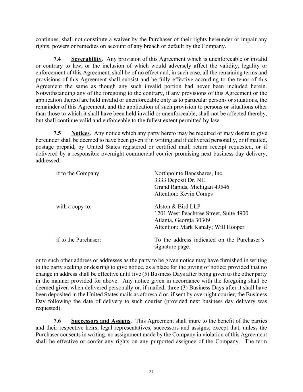 21 continues, shall not constitute a waiver by the Purchaser of their rights hereunder or impair any rights, powers or remedies on account of any breach or default by the Company. 7.4 Severability. Any provision of this Agreement which is unenforceable or invalid or contrary to law, or the inclusion of which would adversely affect the validity, legality or enforcement of this Agreement, shall be of no effect and, in such case, all the remaining terms and provisions of this Agreement shall subsist and be fully effective according to the tenor of this Agreement the same as though any such invalid portion had never been included herein. Notwithstanding any of the foregoing to the contrary, if any provisions of this Agreement or the application thereof are held invalid or unenforceable only as to particular persons or situations, the remainder of this Agreement, and the application of such provision to persons or situations other than those to which it shall have been held invalid or unenforceable, shall not be affected thereby, but shall continue valid and enforceable to the fullest extent permitted by law. 7.5 Notices. Any notice which any party hereto may be required or may desire to give hereunder shall be deemed to have been given if in writing and if delivered personally, or if mailed, postage prepaid, by United States registered or certified mail, return receipt requested, or if delivered by a responsible overnight commercial courier promising next business day delivery, addressed: if to the Company: Northpointe Bancshares, Inc. 3333 Deposit Dr. NE Grand Rapids, Michigan 49546 Attention: Kevin Comps with a copy to: Alston & Bird LLP 1201 West Peachtree Street, Suite 4900 Atlanta, Georgia 30309 Attention: Mark Kanaly; Will Hooper if to the Purchaser: To the address indicated on the Purchaser’s signature page. or to such other address or addresses as the party to be given notice may have furnished in writing to the party seeking or desiring to give notice, as a place for the giving of notice; provided that no change in address shall be effective until five (5) Business Days after being given to the other party in the manner provided for above. Any notice given in accordance with the foregoing shall be deemed given when delivered personally or, if mailed, three (3) Business Days after it shall have been deposited in the United States mails as aforesaid or, if sent by overnight courier, the Business Day following the date of delivery to such courier (provided next business day delivery was requested). 7.6 Successors and Assigns. This Agreement shall inure to the benefit of the parties and their respective heirs, legal representatives, successors and assigns; except that, unless the Purchaser consents in writing, no assignment made by the Company in violation of this Agreement shall be effective or confer any rights on any purported assignee of the Company. The term