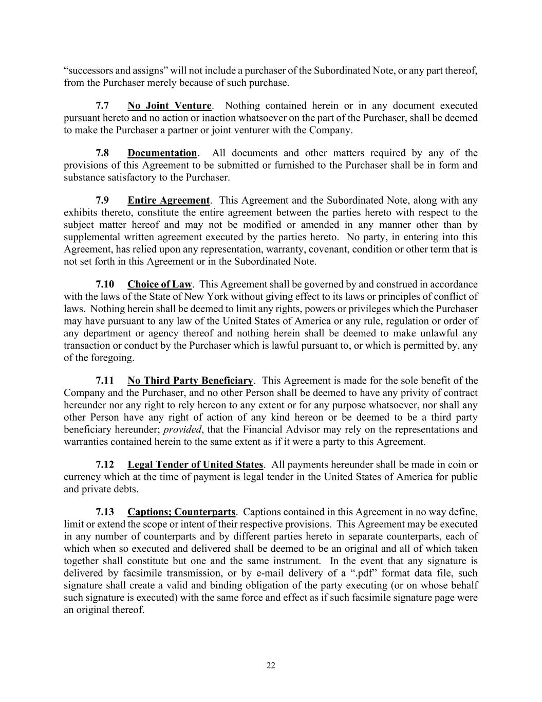 22 “successors and assigns” will not include a purchaser of the Subordinated Note, or any part thereof, from the Purchaser merely because of such purchase. 7.7 No Joint Venture. Nothing contained herein or in any document executed pursuant hereto and no action or inaction whatsoever on the part of the Purchaser, shall be deemed to make the Purchaser a partner or joint venturer with the Company. 7.8 Documentation. All documents and other matters required by any of the provisions of this Agreement to be submitted or furnished to the Purchaser shall be in form and substance satisfactory to the Purchaser. 7.9 Entire Agreement. This Agreement and the Subordinated Note, along with any exhibits thereto, constitute the entire agreement between the parties hereto with respect to the subject matter hereof and may not be modified or amended in any manner other than by supplemental written agreement executed by the parties hereto. No party, in entering into this Agreement, has relied upon any representation, warranty, covenant, condition or other term that is not set forth in this Agreement or in the Subordinated Note. 7.10 Choice of Law. This Agreement shall be governed by and construed in accordance with the laws of the State of New York without giving effect to its laws or principles of conflict of laws. Nothing herein shall be deemed to limit any rights, powers or privileges which the Purchaser may have pursuant to any law of the United States of America or any rule, regulation or order of any department or agency thereof and nothing herein shall be deemed to make unlawful any transaction or conduct by the Purchaser which is lawful pursuant to, or which is permitted by, any of the foregoing. 7.11 No Third Party Beneficiary. This Agreement is made for the sole benefit of the Company and the Purchaser, and no other Person shall be deemed to have any privity of contract hereunder nor any right to rely hereon to any extent or for any purpose whatsoever, nor shall any other Person have any right of action of any kind hereon or be deemed to be a third party beneficiary hereunder; provided, that the Financial Advisor may rely on the representations and warranties contained herein to the same extent as if it were a party to this Agreement. 7.12 Legal Tender of United States. All payments hereunder shall be made in coin or currency which at the time of payment is legal tender in the United States of America for public and private debts. 7.13 Captions; Counterparts. Captions contained in this Agreement in no way define, limit or extend the scope or intent of their respective provisions. This Agreement may be executed in any number of counterparts and by different parties hereto in separate counterparts, each of which when so executed and delivered shall be deemed to be an original and all of which taken together shall constitute but one and the same instrument. In the event that any signature is delivered by facsimile transmission, or by e-mail delivery of a “.pdf” format data file, such signature shall create a valid and binding obligation of the party executing (or on whose behalf such signature is executed) with the same force and effect as if such facsimile signature page were an original thereof.
