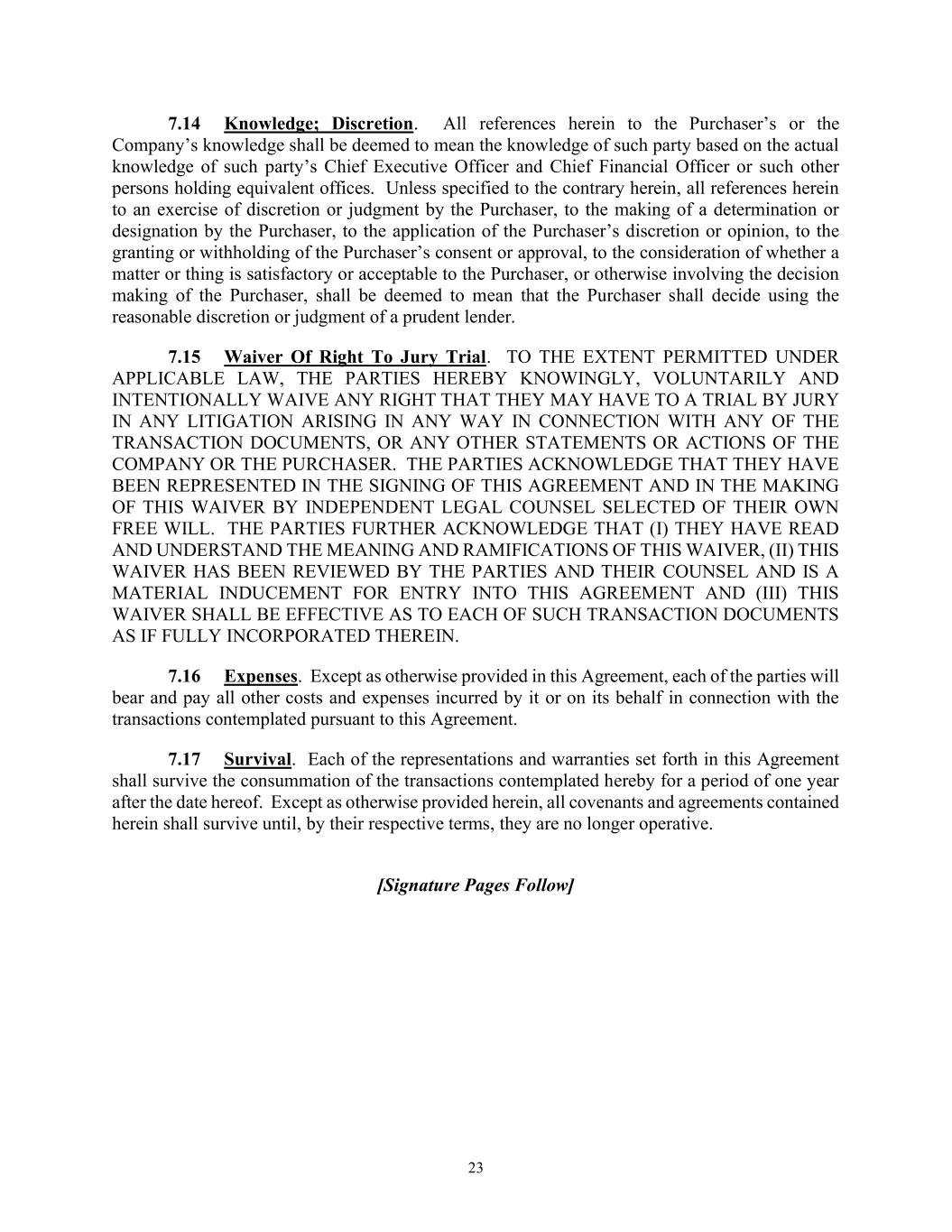 23 7.14 Knowledge; Discretion. All references herein to the Purchaser’s or the Company’s knowledge shall be deemed to mean the knowledge of such party based on the actual knowledge of such party’s Chief Executive Officer and Chief Financial Officer or such other persons holding equivalent offices. Unless specified to the contrary herein, all references herein to an exercise of discretion or judgment by the Purchaser, to the making of a determination or designation by the Purchaser, to the application of the Purchaser’s discretion or opinion, to the granting or withholding of the Purchaser’s consent or approval, to the consideration of whether a matter or thing is satisfactory or acceptable to the Purchaser, or otherwise involving the decision making of the Purchaser, shall be deemed to mean that the Purchaser shall decide using the reasonable discretion or judgment of a prudent lender. 7.15 Waiver Of Right To Jury Trial. TO THE EXTENT PERMITTED UNDER APPLICABLE LAW, THE PARTIES HEREBY KNOWINGLY, VOLUNTARILY AND INTENTIONALLY WAIVE ANY RIGHT THAT THEY MAY HAVE TO A TRIAL BY JURY IN ANY LITIGATION ARISING IN ANY WAY IN CONNECTION WITH ANY OF THE TRANSACTION DOCUMENTS, OR ANY OTHER STATEMENTS OR ACTIONS OF THE COMPANY OR THE PURCHASER. THE PARTIES ACKNOWLEDGE THAT THEY HAVE BEEN REPRESENTED IN THE SIGNING OF THIS AGREEMENT AND IN THE MAKING OF THIS WAIVER BY INDEPENDENT LEGAL COUNSEL SELECTED OF THEIR OWN FREE WILL. THE PARTIES FURTHER ACKNOWLEDGE THAT (I) THEY HAVE READ AND UNDERSTAND THE MEANING AND RAMIFICATIONS OF THIS WAIVER, (II) THIS WAIVER HAS BEEN REVIEWED BY THE PARTIES AND THEIR COUNSEL AND IS A MATERIAL INDUCEMENT FOR ENTRY INTO THIS AGREEMENT AND (III) THIS WAIVER SHALL BE EFFECTIVE AS TO EACH OF SUCH TRANSACTION DOCUMENTS AS IF FULLY INCORPORATED THEREIN. 7.16 Expenses. Except as otherwise provided in this Agreement, each of the parties will bear and pay all other costs and expenses incurred by it or on its behalf in connection with the transactions contemplated pursuant to this Agreement. 7.17 Survival. Each of the representations and warranties set forth in this Agreement shall survive the consummation of the transactions contemplated hereby for a period of one year after the date hereof. Except as otherwise provided herein, all covenants and agreements contained herein shall survive until, by their respective terms, they are no longer operative. [Signature Pages Follow]