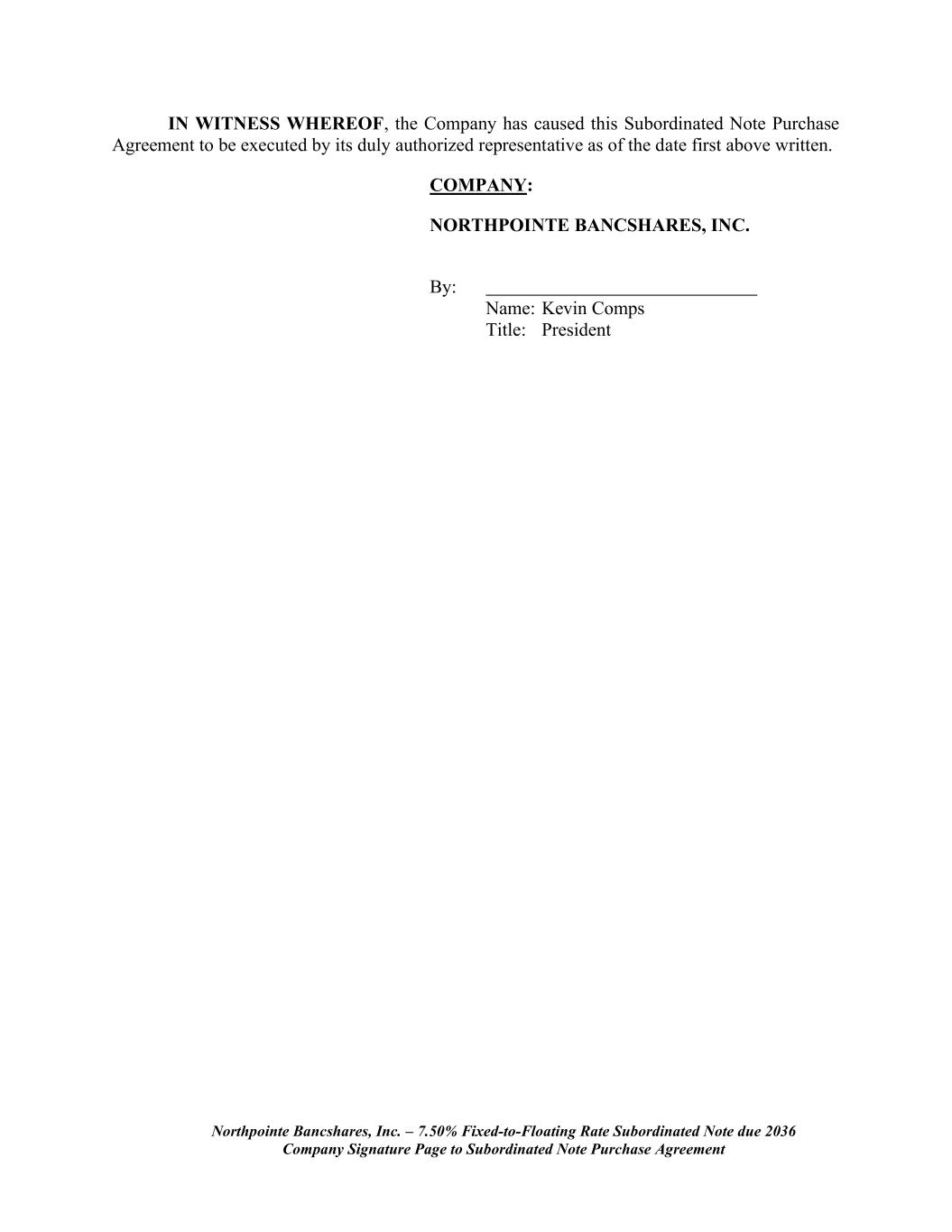 Northpointe Bancshares, Inc. – 7.50% Fixed-to-Floating Rate Subordinated Note due 2036 Company Signature Page to Subordinated Note Purchase Agreement IN WITNESS WHEREOF, the Company has caused this Subordinated Note Purchase Agreement to be executed by its duly authorized representative as of the date first above written. COMPANY: NORTHPOINTE BANCSHARES, INC. By: Name: Kevin Comps Title: President