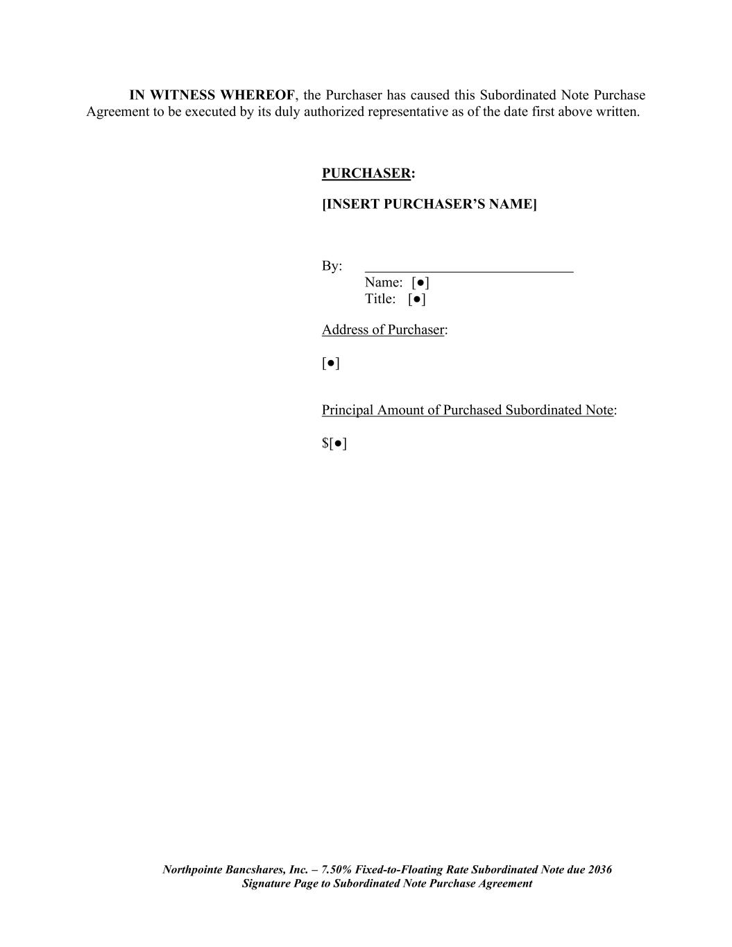 Northpointe Bancshares, Inc. – 7.50% Fixed-to-Floating Rate Subordinated Note due 2036 Signature Page to Subordinated Note Purchase Agreement IN WITNESS WHEREOF, the Purchaser has caused this Subordinated Note Purchase Agreement to be executed by its duly authorized representative as of the date first above written. PURCHASER: [INSERT PURCHASER’S NAME] By: Name: [●] Title: [●] Address of Purchaser: [●] Principal Amount of Purchased Subordinated Note: $[●]