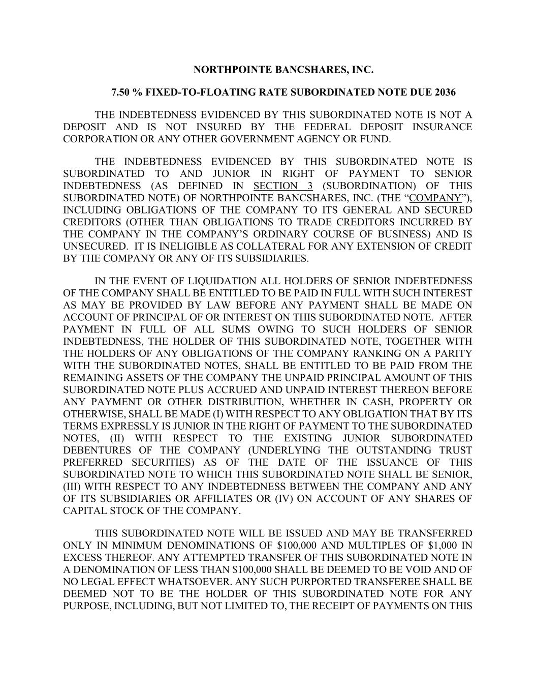 NORTHPOINTE BANCSHARES, INC. 7.50 % FIXED-TO-FLOATING RATE SUBORDINATED NOTE DUE 2036 THE INDEBTEDNESS EVIDENCED BY THIS SUBORDINATED NOTE IS NOT A DEPOSIT AND IS NOT INSURED BY THE FEDERAL DEPOSIT INSURANCE CORPORATION OR ANY OTHER GOVERNMENT AGENCY OR FUND. THE INDEBTEDNESS EVIDENCED BY THIS SUBORDINATED NOTE IS SUBORDINATED TO AND JUNIOR IN RIGHT OF PAYMENT TO SENIOR INDEBTEDNESS (AS DEFINED IN SECTION 3 (SUBORDINATION) OF THIS SUBORDINATED NOTE) OF NORTHPOINTE BANCSHARES, INC. (THE “COMPANY”), INCLUDING OBLIGATIONS OF THE COMPANY TO ITS GENERAL AND SECURED CREDITORS (OTHER THAN OBLIGATIONS TO TRADE CREDITORS INCURRED BY THE COMPANY IN THE COMPANY’S ORDINARY COURSE OF BUSINESS) AND IS UNSECURED. IT IS INELIGIBLE AS COLLATERAL FOR ANY EXTENSION OF CREDIT BY THE COMPANY OR ANY OF ITS SUBSIDIARIES. IN THE EVENT OF LIQUIDATION ALL HOLDERS OF SENIOR INDEBTEDNESS OF THE COMPANY SHALL BE ENTITLED TO BE PAID IN FULL WITH SUCH INTEREST AS MAY BE PROVIDED BY LAW BEFORE ANY PAYMENT SHALL BE MADE ON ACCOUNT OF PRINCIPAL OF OR INTEREST ON THIS SUBORDINATED NOTE. AFTER PAYMENT IN FULL OF ALL SUMS OWING TO SUCH HOLDERS OF SENIOR INDEBTEDNESS, THE HOLDER OF THIS SUBORDINATED NOTE, TOGETHER WITH THE HOLDERS OF ANY OBLIGATIONS OF THE COMPANY RANKING ON A PARITY WITH THE SUBORDINATED NOTES, SHALL BE ENTITLED TO BE PAID FROM THE REMAINING ASSETS OF THE COMPANY THE UNPAID PRINCIPAL AMOUNT OF THIS SUBORDINATED NOTE PLUS ACCRUED AND UNPAID INTEREST THEREON BEFORE ANY PAYMENT OR OTHER DISTRIBUTION, WHETHER IN CASH, PROPERTY OR OTHERWISE, SHALL BE MADE (I) WITH RESPECT TO ANY OBLIGATION THAT BY ITS TERMS EXPRESSLY IS JUNIOR IN THE RIGHT OF PAYMENT TO THE SUBORDINATED NOTES, (II) WITH RESPECT TO THE EXISTING JUNIOR SUBORDINATED DEBENTURES OF THE COMPANY (UNDERLYING THE OUTSTANDING TRUST PREFERRED SECURITIES) AS OF THE DATE OF THE ISSUANCE OF THIS SUBORDINATED NOTE TO WHICH THIS SUBORDINATED NOTE SHALL BE SENIOR, (III) WITH RESPECT TO ANY INDEBTEDNESS BETWEEN THE COMPANY AND ANY OF ITS SUBSIDIARIES OR AFFILIATES OR (IV) ON ACCOUNT OF ANY SHARES OF CAPITAL STOCK OF THE COMPANY. THIS SUBORDINATED NOTE WILL BE ISSUED AND MAY BE TRANSFERRED ONLY IN MINIMUM DENOMINATIONS OF $100,000 AND MULTIPLES OF $1,000 IN EXCESS THEREOF. ANY ATTEMPTED TRANSFER OF THIS SUBORDINATED NOTE IN A DENOMINATION OF LESS THAN $100,000 SHALL BE DEEMED TO BE VOID AND OF NO LEGAL EFFECT WHATSOEVER. ANY SUCH PURPORTED TRANSFEREE SHALL BE DEEMED NOT TO BE THE HOLDER OF THIS SUBORDINATED NOTE FOR ANY PURPOSE, INCLUDING, BUT NOT LIMITED TO, THE RECEIPT OF PAYMENTS ON THIS