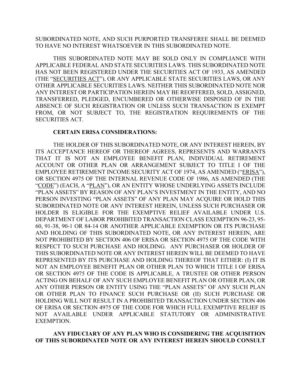 SUBORDINATED NOTE, AND SUCH PURPORTED TRANSFEREE SHALL BE DEEMED TO HAVE NO INTEREST WHATSOEVER IN THIS SUBORDINATED NOTE. THIS SUBORDINATED NOTE MAY BE SOLD ONLY IN COMPLIANCE WITH APPLICABLE FEDERAL AND STATE SECURITIES LAWS. THIS SUBORDINATED NOTE HAS NOT BEEN REGISTERED UNDER THE SECURITIES ACT OF 1933, AS AMENDED (THE “SECURITIES ACT”), OR ANY APPLICABLE STATE SECURITIES LAWS, OR ANY OTHER APPLICABLE SECURITIES LAWS. NEITHER THIS SUBORDINATED NOTE NOR ANY INTEREST OR PARTICIPATION HEREIN MAY BE REOFFERED, SOLD, ASSIGNED, TRANSFERRED, PLEDGED, ENCUMBERED OR OTHERWISE DISPOSED OF IN THE ABSENCE OF SUCH REGISTRATION OR UNLESS SUCH TRANSACTION IS EXEMPT FROM, OR NOT SUBJECT TO, THE REGISTRATION REQUIREMENTS OF THE SECURITIES ACT. CERTAIN ERISA CONSIDERATIONS: THE HOLDER OF THIS SUBORDINATED NOTE, OR ANY INTEREST HEREIN, BY ITS ACCEPTANCE HEREOF OR THEREOF AGREES, REPRESENTS AND WARRANTS THAT IT IS NOT AN EMPLOYEE BENEFIT PLAN, INDIVIDUAL RETIREMENT ACCOUNT OR OTHER PLAN OR ARRANGEMENT SUBJECT TO TITLE I OF THE EMPLOYEE RETIREMENT INCOME SECURITY ACT OF 1974, AS AMENDED (“ERISA”), OR SECTION 4975 OF THE INTERNAL REVENUE CODE OF 1986, AS AMENDED (THE “CODE”) (EACH, A “PLAN”), OR AN ENTITY WHOSE UNDERLYING ASSETS INCLUDE “PLAN ASSETS” BY REASON OF ANY PLAN’S INVESTMENT IN THE ENTITY, AND NO PERSON INVESTING “PLAN ASSETS” OF ANY PLAN MAY ACQUIRE OR HOLD THIS SUBORDINATED NOTE OR ANY INTEREST HEREIN, UNLESS SUCH PURCHASER OR HOLDER IS ELIGIBLE FOR THE EXEMPTIVE RELIEF AVAILABLE UNDER U.S. DEPARTMENT OF LABOR PROHIBITED TRANSACTION CLASS EXEMPTION 96-23, 95- 60, 91-38, 90-1 OR 84-14 OR ANOTHER APPLICABLE EXEMPTION OR ITS PURCHASE AND HOLDING OF THIS SUBORDINATED NOTE, OR ANY INTEREST HEREIN, ARE NOT PROHIBITED BY SECTION 406 OF ERISA OR SECTION 4975 OF THE CODE WITH RESPECT TO SUCH PURCHASE AND HOLDING. ANY PURCHASER OR HOLDER OF THIS SUBORDINATED NOTE OR ANY INTEREST HEREIN WILL BE DEEMED TO HAVE REPRESENTED BY ITS PURCHASE AND HOLDING THEREOF THAT EITHER: (I) IT IS NOT AN EMPLOYEE BENEFIT PLAN OR OTHER PLAN TO WHICH TITLE I OF ERISA OR SECTION 4975 OF THE CODE IS APPLICABLE, A TRUSTEE OR OTHER PERSON ACTING ON BEHALF OF ANY SUCH EMPLOYEE BENEFIT PLAN OR OTHER PLAN, OR ANY OTHER PERSON OR ENTITY USING THE “PLAN ASSETS” OF ANY SUCH PLAN OR OTHER PLAN TO FINANCE SUCH PURCHASE OR (II) SUCH PURCHASE OR HOLDING WILL NOT RESULT IN A PROHIBITED TRANSACTION UNDER SECTION 406 OF ERISA OR SECTION 4975 OF THE CODE FOR WHICH FULL EXEMPTIVE RELIEF IS NOT AVAILABLE UNDER APPLICABLE STATUTORY OR ADMINISTRATIVE EXEMPTION. ANY FIDUCIARY OF ANY PLAN WHO IS CONSIDERING THE ACQUISITION OF THIS SUBORDINATED NOTE OR ANY INTEREST HEREIN SHOULD CONSULT