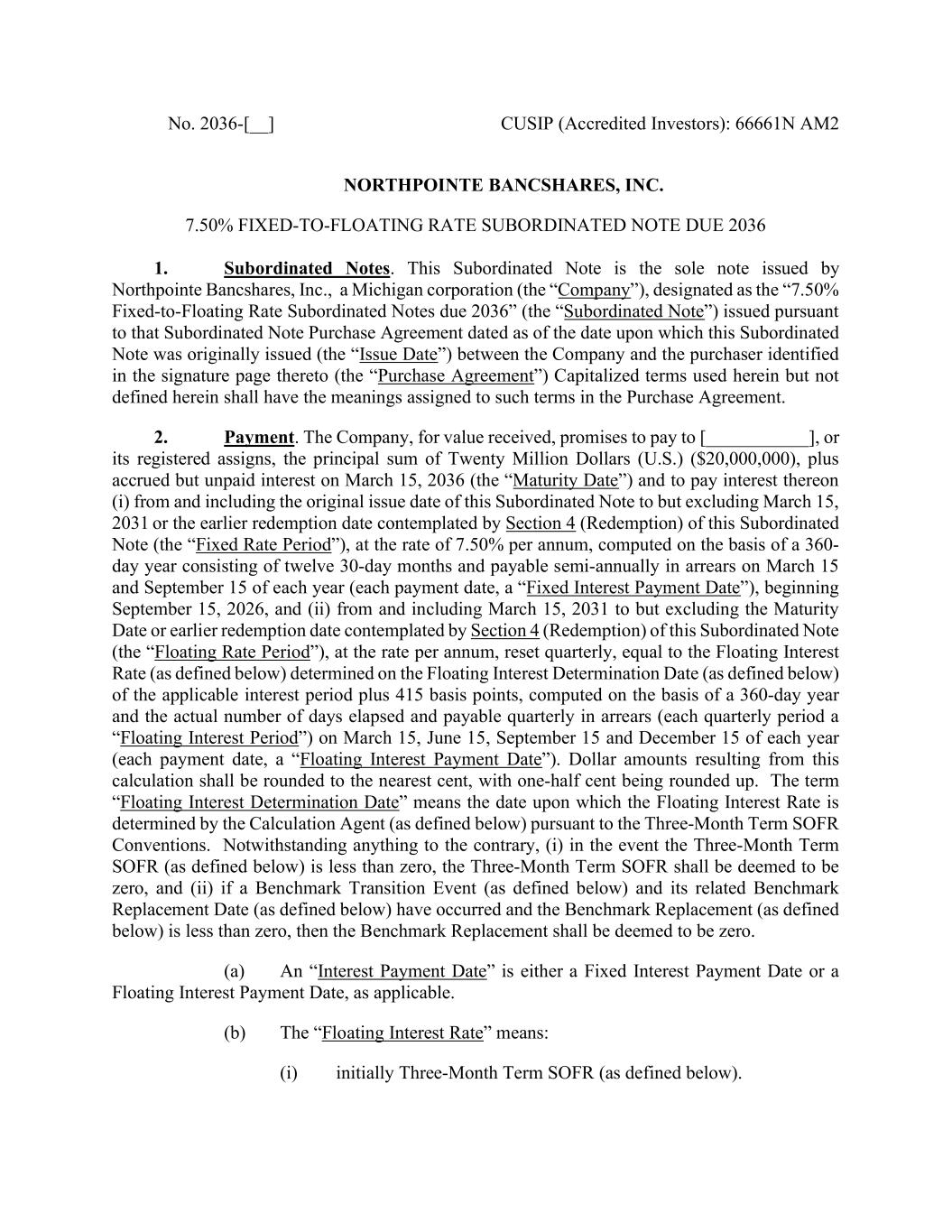 No. 2036-[__] CUSIP (Accredited Investors): 66661N AM2 NORTHPOINTE BANCSHARES, INC. 7.50% FIXED-TO-FLOATING RATE SUBORDINATED NOTE DUE 2036 1. Subordinated Notes. This Subordinated Note is the sole note issued by Northpointe Bancshares, Inc., a Michigan corporation (the “Company”), designated as the “7.50% Fixed-to-Floating Rate Subordinated Notes due 2036” (the “Subordinated Note”) issued pursuant to that Subordinated Note Purchase Agreement dated as of the date upon which this Subordinated Note was originally issued (the “Issue Date”) between the Company and the purchaser identified in the signature page thereto (the “Purchase Agreement”) Capitalized terms used herein but not defined herein shall have the meanings assigned to such terms in the Purchase Agreement. 2. Payment. The Company, for value received, promises to pay to [___________], or its registered assigns, the principal sum of Twenty Million Dollars (U.S.) ($20,000,000), plus accrued but unpaid interest on March 15, 2036 (the “Maturity Date”) and to pay interest thereon (i) from and including the original issue date of this Subordinated Note to but excluding March 15, 2031 or the earlier redemption date contemplated by Section 4 (Redemption) of this Subordinated Note (the “Fixed Rate Period”), at the rate of 7.50% per annum, computed on the basis of a 360- day year consisting of twelve 30-day months and payable semi-annually in arrears on March 15 and September 15 of each year (each payment date, a “Fixed Interest Payment Date”), beginning September 15, 2026, and (ii) from and including March 15, 2031 to but excluding the Maturity Date or earlier redemption date contemplated by Section 4 (Redemption) of this Subordinated Note (the “Floating Rate Period”), at the rate per annum, reset quarterly, equal to the Floating Interest Rate (as defined below) determined on the Floating Interest Determination Date (as defined below) of the applicable interest period plus 415 basis points, computed on the basis of a 360-day year and the actual number of days elapsed and payable quarterly in arrears (each quarterly period a “Floating Interest Period”) on March 15, June 15, September 15 and December 15 of each year (each payment date, a “Floating Interest Payment Date”). Dollar amounts resulting from this calculation shall be rounded to the nearest cent, with one-half cent being rounded up. The term “Floating Interest Determination Date” means the date upon which the Floating Interest Rate is determined by the Calculation Agent (as defined below) pursuant to the Three-Month Term SOFR Conventions. Notwithstanding anything to the contrary, (i) in the event the Three-Month Term SOFR (as defined below) is less than zero, the Three-Month Term SOFR shall be deemed to be zero, and (ii) if a Benchmark Transition Event (as defined below) and its related Benchmark Replacement Date (as defined below) have occurred and the Benchmark Replacement (as defined below) is less than zero, then the Benchmark Replacement shall be deemed to be zero. (a) An “Interest Payment Date” is either a Fixed Interest Payment Date or a Floating Interest Payment Date, as applicable. (b) The “Floating Interest Rate” means: (i) initially Three-Month Term SOFR (as defined below).