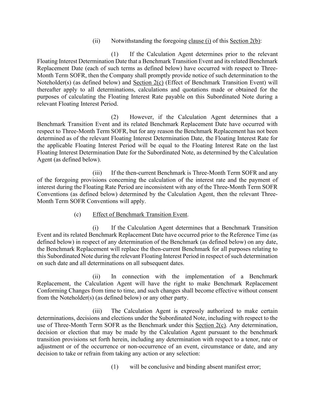 (ii) Notwithstanding the foregoing clause (i) of this Section 2(b): (1) If the Calculation Agent determines prior to the relevant Floating Interest Determination Date that a Benchmark Transition Event and its related Benchmark Replacement Date (each of such terms as defined below) have occurred with respect to Three- Month Term SOFR, then the Company shall promptly provide notice of such determination to the Noteholder(s) (as defined below) and Section 2(c) (Effect of Benchmark Transition Event) will thereafter apply to all determinations, calculations and quotations made or obtained for the purposes of calculating the Floating Interest Rate payable on this Subordinated Note during a relevant Floating Interest Period. (2) However, if the Calculation Agent determines that a Benchmark Transition Event and its related Benchmark Replacement Date have occurred with respect to Three-Month Term SOFR, but for any reason the Benchmark Replacement has not been determined as of the relevant Floating Interest Determination Date, the Floating Interest Rate for the applicable Floating Interest Period will be equal to the Floating Interest Rate on the last Floating Interest Determination Date for the Subordinated Note, as determined by the Calculation Agent (as defined below). (iii) If the then-current Benchmark is Three-Month Term SOFR and any of the foregoing provisions concerning the calculation of the interest rate and the payment of interest during the Floating Rate Period are inconsistent with any of the Three-Month Term SOFR Conventions (as defined below) determined by the Calculation Agent, then the relevant Three- Month Term SOFR Conventions will apply. (c) Effect of Benchmark Transition Event. (i) If the Calculation Agent determines that a Benchmark Transition Event and its related Benchmark Replacement Date have occurred prior to the Reference Time (as defined below) in respect of any determination of the Benchmark (as defined below) on any date, the Benchmark Replacement will replace the then-current Benchmark for all purposes relating to this Subordinated Note during the relevant Floating Interest Period in respect of such determination on such date and all determinations on all subsequent dates. (ii) In connection with the implementation of a Benchmark Replacement, the Calculation Agent will have the right to make Benchmark Replacement Conforming Changes from time to time, and such changes shall become effective without consent from the Noteholder(s) (as defined below) or any other party. (iii) The Calculation Agent is expressly authorized to make certain determinations, decisions and elections under the Subordinated Note, including with respect to the use of Three-Month Term SOFR as the Benchmark under this Section 2(c). Any determination, decision or election that may be made by the Calculation Agent pursuant to the benchmark transition provisions set forth herein, including any determination with respect to a tenor, rate or adjustment or of the occurrence or non-occurrence of an event, circumstance or date, and any decision to take or refrain from taking any action or any selection: (1) will be conclusive and binding absent manifest error;