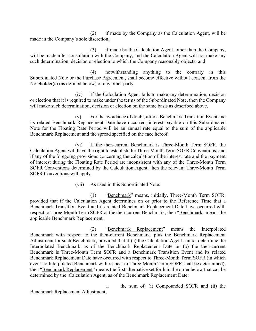 (2) if made by the Company as the Calculation Agent, will be made in the Company’s sole discretion; (3) if made by the Calculation Agent, other than the Company, will be made after consultation with the Company, and the Calculation Agent will not make any such determination, decision or election to which the Company reasonably objects; and (4) notwithstanding anything to the contrary in this Subordinated Note or the Purchase Agreement, shall become effective without consent from the Noteholder(s) (as defined below) or any other party. (iv) If the Calculation Agent fails to make any determination, decision or election that it is required to make under the terms of the Subordinated Note, then the Company will make such determination, decision or election on the same basis as described above. (v) For the avoidance of doubt, after a Benchmark Transition Event and its related Benchmark Replacement Date have occurred, interest payable on this Subordinated Note for the Floating Rate Period will be an annual rate equal to the sum of the applicable Benchmark Replacement and the spread specified on the face hereof. (vi) If the then-current Benchmark is Three-Month Term SOFR, the Calculation Agent will have the right to establish the Three-Month Term SOFR Conventions, and if any of the foregoing provisions concerning the calculation of the interest rate and the payment of interest during the Floating Rate Period are inconsistent with any of the Three-Month Term SOFR Conventions determined by the Calculation Agent, then the relevant Three-Month Term SOFR Conventions will apply. (vii) As used in this Subordinated Note: (1) “Benchmark” means, initially, Three-Month Term SOFR; provided that if the Calculation Agent determines on or prior to the Reference Time that a Benchmark Transition Event and its related Benchmark Replacement Date have occurred with respect to Three-Month Term SOFR or the then-current Benchmark, then “Benchmark” means the applicable Benchmark Replacement. (2) “Benchmark Replacement” means the Interpolated Benchmark with respect to the then-current Benchmark, plus the Benchmark Replacement Adjustment for such Benchmark; provided that if (a) the Calculation Agent cannot determine the Interpolated Benchmark as of the Benchmark Replacement Date or (b) the then-current Benchmark is Three-Month Term SOFR and a Benchmark Transition Event and its related Benchmark Replacement Date have occurred with respect to Three-Month Term SOFR (in which event no Interpolated Benchmark with respect to Three-Month Term SOFR shall be determined), then “Benchmark Replacement” means the first alternative set forth in the order below that can be determined by the Calculation Agent, as of the Benchmark Replacement Date: a. the sum of: (i) Compounded SOFR and (ii) the Benchmark Replacement Adjustment;