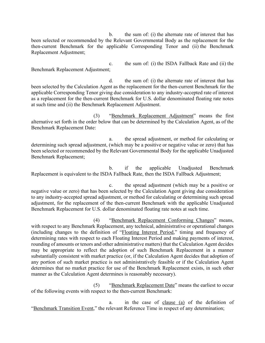 b. the sum of: (i) the alternate rate of interest that has been selected or recommended by the Relevant Governmental Body as the replacement for the then-current Benchmark for the applicable Corresponding Tenor and (ii) the Benchmark Replacement Adjustment; c. the sum of: (i) the ISDA Fallback Rate and (ii) the Benchmark Replacement Adjustment; d. the sum of: (i) the alternate rate of interest that has been selected by the Calculation Agent as the replacement for the then-current Benchmark for the applicable Corresponding Tenor giving due consideration to any industry-accepted rate of interest as a replacement for the then-current Benchmark for U.S. dollar denominated floating rate notes at such time and (ii) the Benchmark Replacement Adjustment. (3) “Benchmark Replacement Adjustment” means the first alternative set forth in the order below that can be determined by the Calculation Agent, as of the Benchmark Replacement Date: a. the spread adjustment, or method for calculating or determining such spread adjustment, (which may be a positive or negative value or zero) that has been selected or recommended by the Relevant Governmental Body for the applicable Unadjusted Benchmark Replacement; b. if the applicable Unadjusted Benchmark Replacement is equivalent to the ISDA Fallback Rate, then the ISDA Fallback Adjustment; c. the spread adjustment (which may be a positive or negative value or zero) that has been selected by the Calculation Agent giving due consideration to any industry-accepted spread adjustment, or method for calculating or determining such spread adjustment, for the replacement of the then-current Benchmark with the applicable Unadjusted Benchmark Replacement for U.S. dollar denominated floating rate notes at such time. (4) “Benchmark Replacement Conforming Changes” means, with respect to any Benchmark Replacement, any technical, administrative or operational changes (including changes to the definition of “Floating Interest Period,” timing and frequency of determining rates with respect to each Floating Interest Period and making payments of interest, rounding of amounts or tenors and other administrative matters) that the Calculation Agent decides may be appropriate to reflect the adoption of such Benchmark Replacement in a manner substantially consistent with market practice (or, if the Calculation Agent decides that adoption of any portion of such market practice is not administratively feasible or if the Calculation Agent determines that no market practice for use of the Benchmark Replacement exists, in such other manner as the Calculation Agent determines is reasonably necessary). (5) “Benchmark Replacement Date” means the earliest to occur of the following events with respect to the then-current Benchmark: a. in the case of clause (a) of the definition of “Benchmark Transition Event,” the relevant Reference Time in respect of any determination;