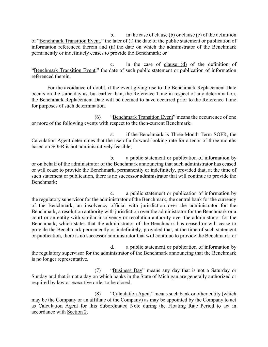 b. in the case of clause (b) or clause (c) of the definition of “Benchmark Transition Event,” the later of (i) the date of the public statement or publication of information referenced therein and (ii) the date on which the administrator of the Benchmark permanently or indefinitely ceases to provide the Benchmark; or c. in the case of clause (d) of the definition of “Benchmark Transition Event,” the date of such public statement or publication of information referenced therein. For the avoidance of doubt, if the event giving rise to the Benchmark Replacement Date occurs on the same day as, but earlier than, the Reference Time in respect of any determination, the Benchmark Replacement Date will be deemed to have occurred prior to the Reference Time for purposes of such determination. (6) “Benchmark Transition Event” means the occurrence of one or more of the following events with respect to the then-current Benchmark: a. if the Benchmark is Three-Month Term SOFR, the Calculation Agent determines that the use of a forward-looking rate for a tenor of three months based on SOFR is not administratively feasible; b. a public statement or publication of information by or on behalf of the administrator of the Benchmark announcing that such administrator has ceased or will cease to provide the Benchmark, permanently or indefinitely, provided that, at the time of such statement or publication, there is no successor administrator that will continue to provide the Benchmark; c. a public statement or publication of information by the regulatory supervisor for the administrator of the Benchmark, the central bank for the currency of the Benchmark, an insolvency official with jurisdiction over the administrator for the Benchmark, a resolution authority with jurisdiction over the administrator for the Benchmark or a court or an entity with similar insolvency or resolution authority over the administrator for the Benchmark, which states that the administrator of the Benchmark has ceased or will cease to provide the Benchmark permanently or indefinitely, provided that, at the time of such statement or publication, there is no successor administrator that will continue to provide the Benchmark; or d. a public statement or publication of information by the regulatory supervisor for the administrator of the Benchmark announcing that the Benchmark is no longer representative. (7) “Business Day” means any day that is not a Saturday or Sunday and that is not a day on which banks in the State of Michigan are generally authorized or required by law or executive order to be closed. (8) “Calculation Agent” means such bank or other entity (which may be the Company or an affiliate of the Company) as may be appointed by the Company to act as Calculation Agent for this Subordinated Note during the Floating Rate Period to act in accordance with Section 2.