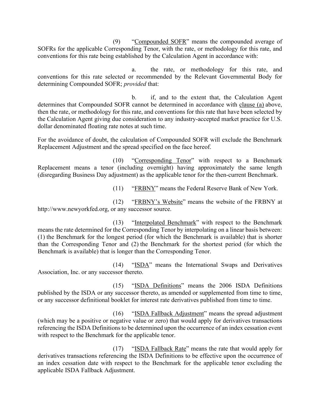 (9) “Compounded SOFR” means the compounded average of SOFRs for the applicable Corresponding Tenor, with the rate, or methodology for this rate, and conventions for this rate being established by the Calculation Agent in accordance with: a. the rate, or methodology for this rate, and conventions for this rate selected or recommended by the Relevant Governmental Body for determining Compounded SOFR; provided that: b. if, and to the extent that, the Calculation Agent determines that Compounded SOFR cannot be determined in accordance with clause (a) above, then the rate, or methodology for this rate, and conventions for this rate that have been selected by the Calculation Agent giving due consideration to any industry-accepted market practice for U.S. dollar denominated floating rate notes at such time. For the avoidance of doubt, the calculation of Compounded SOFR will exclude the Benchmark Replacement Adjustment and the spread specified on the face hereof. (10) “Corresponding Tenor” with respect to a Benchmark Replacement means a tenor (including overnight) having approximately the same length (disregarding Business Day adjustment) as the applicable tenor for the then-current Benchmark. (11) “FRBNY” means the Federal Reserve Bank of New York. (12) “FRBNY’s Website” means the website of the FRBNY at http://www.newyorkfed.org, or any successor source. (13) “Interpolated Benchmark” with respect to the Benchmark means the rate determined for the Corresponding Tenor by interpolating on a linear basis between: (1) the Benchmark for the longest period (for which the Benchmark is available) that is shorter than the Corresponding Tenor and (2) the Benchmark for the shortest period (for which the Benchmark is available) that is longer than the Corresponding Tenor. (14) “ISDA” means the International Swaps and Derivatives Association, Inc. or any successor thereto. (15) “ISDA Definitions” means the 2006 ISDA Definitions published by the ISDA or any successor thereto, as amended or supplemented from time to time, or any successor definitional booklet for interest rate derivatives published from time to time. (16) “ISDA Fallback Adjustment” means the spread adjustment (which may be a positive or negative value or zero) that would apply for derivatives transactions referencing the ISDA Definitions to be determined upon the occurrence of an index cessation event with respect to the Benchmark for the applicable tenor. (17) “ISDA Fallback Rate” means the rate that would apply for derivatives transactions referencing the ISDA Definitions to be effective upon the occurrence of an index cessation date with respect to the Benchmark for the applicable tenor excluding the applicable ISDA Fallback Adjustment.