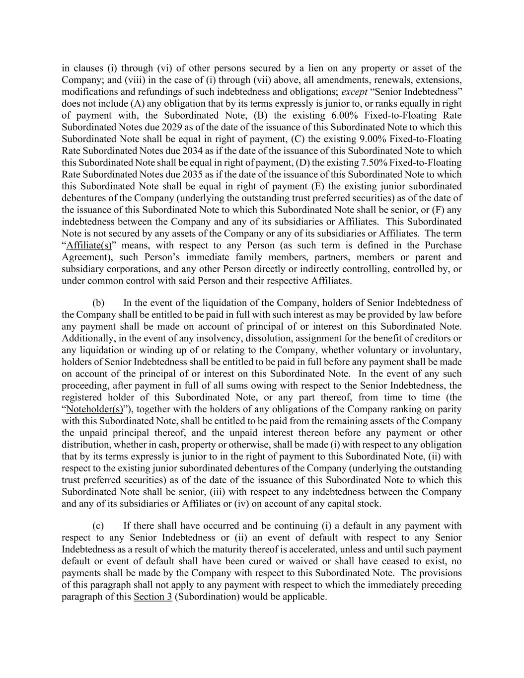 in clauses (i) through (vi) of other persons secured by a lien on any property or asset of the Company; and (viii) in the case of (i) through (vii) above, all amendments, renewals, extensions, modifications and refundings of such indebtedness and obligations; except “Senior Indebtedness” does not include (A) any obligation that by its terms expressly is junior to, or ranks equally in right of payment with, the Subordinated Note, (B) the existing 6.00% Fixed-to-Floating Rate Subordinated Notes due 2029 as of the date of the issuance of this Subordinated Note to which this Subordinated Note shall be equal in right of payment, (C) the existing 9.00% Fixed-to-Floating Rate Subordinated Notes due 2034 as if the date of the issuance of this Subordinated Note to which this Subordinated Note shall be equal in right of payment, (D) the existing 7.50% Fixed-to-Floating Rate Subordinated Notes due 2035 as if the date of the issuance of this Subordinated Note to which this Subordinated Note shall be equal in right of payment (E) the existing junior subordinated debentures of the Company (underlying the outstanding trust preferred securities) as of the date of the issuance of this Subordinated Note to which this Subordinated Note shall be senior, or (F) any indebtedness between the Company and any of its subsidiaries or Affiliates. This Subordinated Note is not secured by any assets of the Company or any of its subsidiaries or Affiliates. The term “Affiliate(s)” means, with respect to any Person (as such term is defined in the Purchase Agreement), such Person’s immediate family members, partners, members or parent and subsidiary corporations, and any other Person directly or indirectly controlling, controlled by, or under common control with said Person and their respective Affiliates. (b) In the event of the liquidation of the Company, holders of Senior Indebtedness of the Company shall be entitled to be paid in full with such interest as may be provided by law before any payment shall be made on account of principal of or interest on this Subordinated Note. Additionally, in the event of any insolvency, dissolution, assignment for the benefit of creditors or any liquidation or winding up of or relating to the Company, whether voluntary or involuntary, holders of Senior Indebtedness shall be entitled to be paid in full before any payment shall be made on account of the principal of or interest on this Subordinated Note. In the event of any such proceeding, after payment in full of all sums owing with respect to the Senior Indebtedness, the registered holder of this Subordinated Note, or any part thereof, from time to time (the “Noteholder(s)”), together with the holders of any obligations of the Company ranking on parity with this Subordinated Note, shall be entitled to be paid from the remaining assets of the Company the unpaid principal thereof, and the unpaid interest thereon before any payment or other distribution, whether in cash, property or otherwise, shall be made (i) with respect to any obligation that by its terms expressly is junior to in the right of payment to this Subordinated Note, (ii) with respect to the existing junior subordinated debentures of the Company (underlying the outstanding trust preferred securities) as of the date of the issuance of this Subordinated Note to which this Subordinated Note shall be senior, (iii) with respect to any indebtedness between the Company and any of its subsidiaries or Affiliates or (iv) on account of any capital stock. (c) If there shall have occurred and be continuing (i) a default in any payment with respect to any Senior Indebtedness or (ii) an event of default with respect to any Senior Indebtedness as a result of which the maturity thereof is accelerated, unless and until such payment default or event of default shall have been cured or waived or shall have ceased to exist, no payments shall be made by the Company with respect to this Subordinated Note. The provisions of this paragraph shall not apply to any payment with respect to which the immediately preceding paragraph of this Section 3 (Subordination) would be applicable.