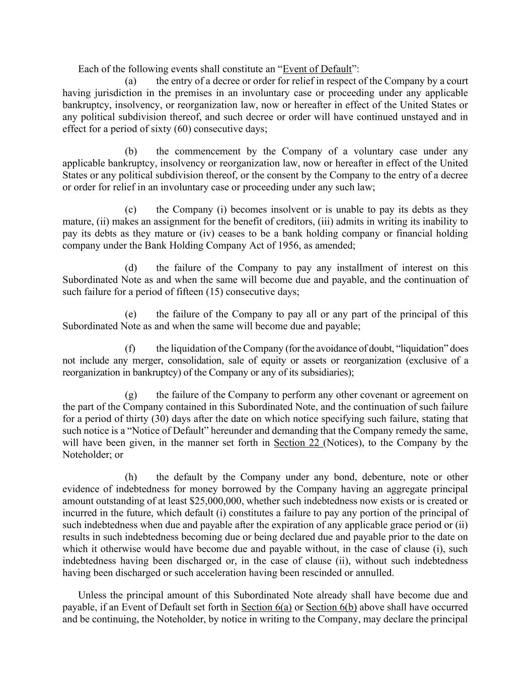 Each of the following events shall constitute an “Event of Default”: (a) the entry of a decree or order for relief in respect of the Company by a court having jurisdiction in the premises in an involuntary case or proceeding under any applicable bankruptcy, insolvency, or reorganization law, now or hereafter in effect of the United States or any political subdivision thereof, and such decree or order will have continued unstayed and in effect for a period of sixty (60) consecutive days; (b) the commencement by the Company of a voluntary case under any applicable bankruptcy, insolvency or reorganization law, now or hereafter in effect of the United States or any political subdivision thereof, or the consent by the Company to the entry of a decree or order for relief in an involuntary case or proceeding under any such law; (c) the Company (i) becomes insolvent or is unable to pay its debts as they mature, (ii) makes an assignment for the benefit of creditors, (iii) admits in writing its inability to pay its debts as they mature or (iv) ceases to be a bank holding company or financial holding company under the Bank Holding Company Act of 1956, as amended; (d) the failure of the Company to pay any installment of interest on this Subordinated Note as and when the same will become due and payable, and the continuation of such failure for a period of fifteen (15) consecutive days; (e) the failure of the Company to pay all or any part of the principal of this Subordinated Note as and when the same will become due and payable; (f) the liquidation of the Company (for the avoidance of doubt, “liquidation” does not include any merger, consolidation, sale of equity or assets or reorganization (exclusive of a reorganization in bankruptcy) of the Company or any of its subsidiaries); (g) the failure of the Company to perform any other covenant or agreement on the part of the Company contained in this Subordinated Note, and the continuation of such failure for a period of thirty (30) days after the date on which notice specifying such failure, stating that such notice is a “Notice of Default” hereunder and demanding that the Company remedy the same, will have been given, in the manner set forth in Section 22 (Notices), to the Company by the Noteholder; or (h) the default by the Company under any bond, debenture, note or other evidence of indebtedness for money borrowed by the Company having an aggregate principal amount outstanding of at least $25,000,000, whether such indebtedness now exists or is created or incurred in the future, which default (i) constitutes a failure to pay any portion of the principal of such indebtedness when due and payable after the expiration of any applicable grace period or (ii) results in such indebtedness becoming due or being declared due and payable prior to the date on which it otherwise would have become due and payable without, in the case of clause (i), such indebtedness having been discharged or, in the case of clause (ii), without such indebtedness having been discharged or such acceleration having been rescinded or annulled. Unless the principal amount of this Subordinated Note already shall have become due and payable, if an Event of Default set forth in Section 6(a) or Section 6(b) above shall have occurred and be continuing, the Noteholder, by notice in writing to the Company, may declare the principal