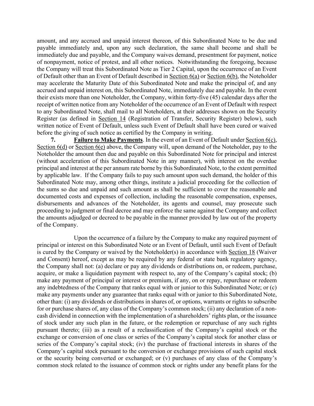 amount, and any accrued and unpaid interest thereon, of this Subordinated Note to be due and payable immediately and, upon any such declaration, the same shall become and shall be immediately due and payable, and the Company waives demand, presentment for payment, notice of nonpayment, notice of protest, and all other notices. Notwithstanding the foregoing, because the Company will treat this Subordinated Note as Tier 2 Capital, upon the occurrence of an Event of Default other than an Event of Default described in Section 6(a) or Section 6(b), the Noteholder may accelerate the Maturity Date of this Subordinated Note and make the principal of, and any accrued and unpaid interest on, this Subordinated Note, immediately due and payable. In the event their exists more than one Noteholder, the Company, within forty-five (45) calendar days after the receipt of written notice from any Noteholder of the occurrence of an Event of Default with respect to any Subordinated Note, shall mail to all Noteholders, at their addresses shown on the Security Register (as defined in Section 14 (Registration of Transfer, Security Register) below), such written notice of Event of Default, unless such Event of Default shall have been cured or waived before the giving of such notice as certified by the Company in writing. 7. Failure to Make Payments. In the event of an Event of Default under Section 6(c), Section 6(d) or Section 6(e) above, the Company will, upon demand of the Noteholder, pay to the Noteholder the amount then due and payable on this Subordinated Note for principal and interest (without acceleration of this Subordinated Note in any manner), with interest on the overdue principal and interest at the per annum rate borne by this Subordinated Note, to the extent permitted by applicable law. If the Company fails to pay such amount upon such demand, the holder of this Subordinated Note may, among other things, institute a judicial proceeding for the collection of the sums so due and unpaid and such amount as shall be sufficient to cover the reasonable and documented costs and expenses of collection, including the reasonable compensation, expenses, disbursements and advances of the Noteholder, its agents and counsel, may prosecute such proceeding to judgment or final decree and may enforce the same against the Company and collect the amounts adjudged or decreed to be payable in the manner provided by law out of the property of the Company. Upon the occurrence of a failure by the Company to make any required payment of principal or interest on this Subordinated Note or an Event of Default, until such Event of Default is cured by the Company or waived by the Noteholder(s) in accordance with Section 18 (Waiver and Consent) hereof, except as may be required by any federal or state bank regulatory agency, the Company shall not: (a) declare or pay any dividends or distributions on, or redeem, purchase, acquire, or make a liquidation payment with respect to, any of the Company’s capital stock; (b) make any payment of principal or interest or premium, if any, on or repay, repurchase or redeem any indebtedness of the Company that ranks equal with or junior to this Subordinated Note; or (c) make any payments under any guarantee that ranks equal with or junior to this Subordinated Note, other than: (i) any dividends or distributions in shares of, or options, warrants or rights to subscribe for or purchase shares of, any class of the Company’s common stock; (ii) any declaration of a non- cash dividend in connection with the implementation of a shareholders’ rights plan, or the issuance of stock under any such plan in the future, or the redemption or repurchase of any such rights pursuant thereto; (iii) as a result of a reclassification of the Company’s capital stock or the exchange or conversion of one class or series of the Company’s capital stock for another class or series of the Company’s capital stock; (iv) the purchase of fractional interests in shares of the Company’s capital stock pursuant to the conversion or exchange provisions of such capital stock or the security being converted or exchanged; or (v) purchases of any class of the Company’s common stock related to the issuance of common stock or rights under any benefit plans for the