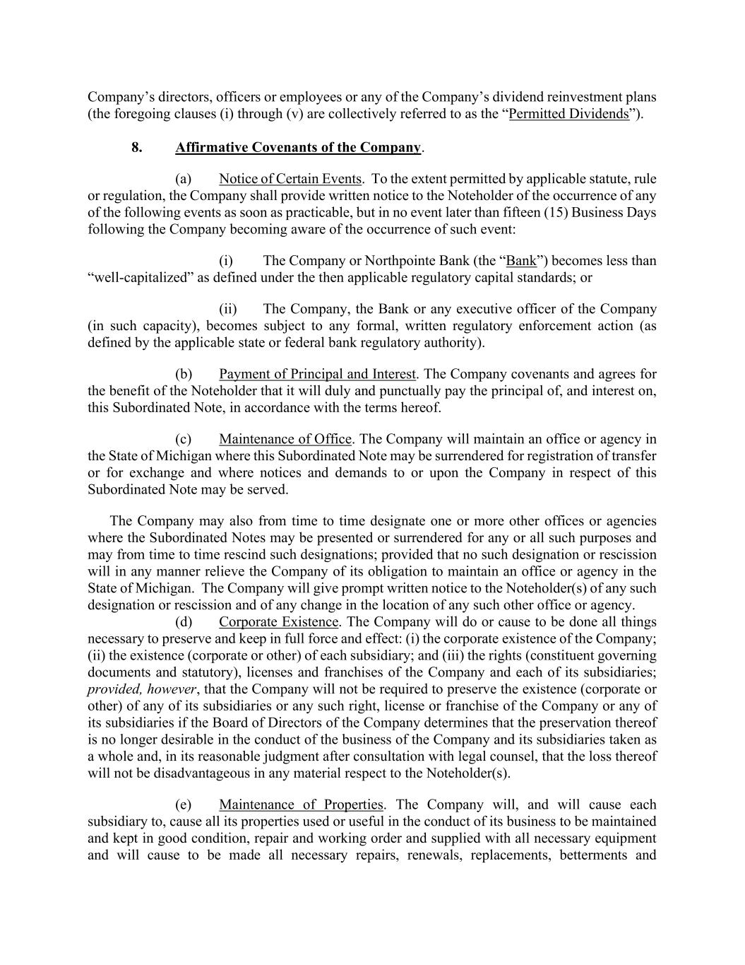 Company’s directors, officers or employees or any of the Company’s dividend reinvestment plans (the foregoing clauses (i) through (v) are collectively referred to as the “Permitted Dividends”). 8. Affirmative Covenants of the Company. (a) Notice of Certain Events. To the extent permitted by applicable statute, rule or regulation, the Company shall provide written notice to the Noteholder of the occurrence of any of the following events as soon as practicable, but in no event later than fifteen (15) Business Days following the Company becoming aware of the occurrence of such event: (i) The Company or Northpointe Bank (the “Bank”) becomes less than “well-capitalized” as defined under the then applicable regulatory capital standards; or (ii) The Company, the Bank or any executive officer of the Company (in such capacity), becomes subject to any formal, written regulatory enforcement action (as defined by the applicable state or federal bank regulatory authority). (b) Payment of Principal and Interest. The Company covenants and agrees for the benefit of the Noteholder that it will duly and punctually pay the principal of, and interest on, this Subordinated Note, in accordance with the terms hereof. (c) Maintenance of Office. The Company will maintain an office or agency in the State of Michigan where this Subordinated Note may be surrendered for registration of transfer or for exchange and where notices and demands to or upon the Company in respect of this Subordinated Note may be served. The Company may also from time to time designate one or more other offices or agencies where the Subordinated Notes may be presented or surrendered for any or all such purposes and may from time to time rescind such designations; provided that no such designation or rescission will in any manner relieve the Company of its obligation to maintain an office or agency in the State of Michigan. The Company will give prompt written notice to the Noteholder(s) of any such designation or rescission and of any change in the location of any such other office or agency. (d) Corporate Existence. The Company will do or cause to be done all things necessary to preserve and keep in full force and effect: (i) the corporate existence of the Company; (ii) the existence (corporate or other) of each subsidiary; and (iii) the rights (constituent governing documents and statutory), licenses and franchises of the Company and each of its subsidiaries; provided, however, that the Company will not be required to preserve the existence (corporate or other) of any of its subsidiaries or any such right, license or franchise of the Company or any of its subsidiaries if the Board of Directors of the Company determines that the preservation thereof is no longer desirable in the conduct of the business of the Company and its subsidiaries taken as a whole and, in its reasonable judgment after consultation with legal counsel, that the loss thereof will not be disadvantageous in any material respect to the Noteholder(s). (e) Maintenance of Properties. The Company will, and will cause each subsidiary to, cause all its properties used or useful in the conduct of its business to be maintained and kept in good condition, repair and working order and supplied with all necessary equipment and will cause to be made all necessary repairs, renewals, replacements, betterments and