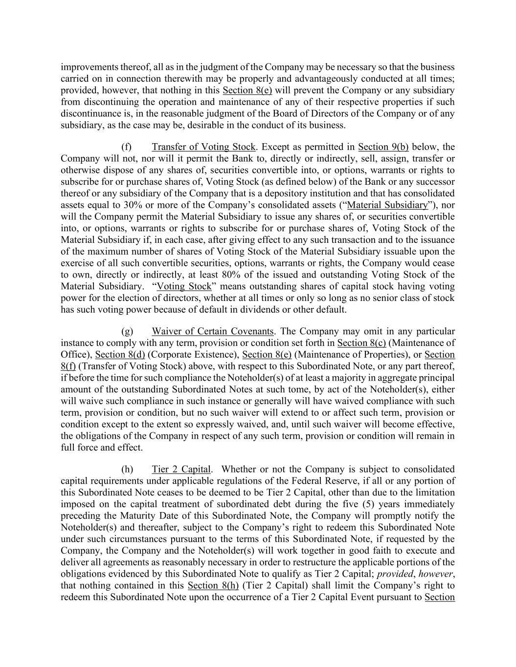 improvements thereof, all as in the judgment of the Company may be necessary so that the business carried on in connection therewith may be properly and advantageously conducted at all times; provided, however, that nothing in this Section 8(e) will prevent the Company or any subsidiary from discontinuing the operation and maintenance of any of their respective properties if such discontinuance is, in the reasonable judgment of the Board of Directors of the Company or of any subsidiary, as the case may be, desirable in the conduct of its business. (f) Transfer of Voting Stock. Except as permitted in Section 9(b) below, the Company will not, nor will it permit the Bank to, directly or indirectly, sell, assign, transfer or otherwise dispose of any shares of, securities convertible into, or options, warrants or rights to subscribe for or purchase shares of, Voting Stock (as defined below) of the Bank or any successor thereof or any subsidiary of the Company that is a depository institution and that has consolidated assets equal to 30% or more of the Company’s consolidated assets (“Material Subsidiary”), nor will the Company permit the Material Subsidiary to issue any shares of, or securities convertible into, or options, warrants or rights to subscribe for or purchase shares of, Voting Stock of the Material Subsidiary if, in each case, after giving effect to any such transaction and to the issuance of the maximum number of shares of Voting Stock of the Material Subsidiary issuable upon the exercise of all such convertible securities, options, warrants or rights, the Company would cease to own, directly or indirectly, at least 80% of the issued and outstanding Voting Stock of the Material Subsidiary. “Voting Stock” means outstanding shares of capital stock having voting power for the election of directors, whether at all times or only so long as no senior class of stock has such voting power because of default in dividends or other default. (g) Waiver of Certain Covenants. The Company may omit in any particular instance to comply with any term, provision or condition set forth in Section 8(c) (Maintenance of Office), Section 8(d) (Corporate Existence), Section 8(e) (Maintenance of Properties), or Section 8(f) (Transfer of Voting Stock) above, with respect to this Subordinated Note, or any part thereof, if before the time for such compliance the Noteholder(s) of at least a majority in aggregate principal amount of the outstanding Subordinated Notes at such tome, by act of the Noteholder(s), either will waive such compliance in such instance or generally will have waived compliance with such term, provision or condition, but no such waiver will extend to or affect such term, provision or condition except to the extent so expressly waived, and, until such waiver will become effective, the obligations of the Company in respect of any such term, provision or condition will remain in full force and effect. (h) Tier 2 Capital. Whether or not the Company is subject to consolidated capital requirements under applicable regulations of the Federal Reserve, if all or any portion of this Subordinated Note ceases to be deemed to be Tier 2 Capital, other than due to the limitation imposed on the capital treatment of subordinated debt during the five (5) years immediately preceding the Maturity Date of this Subordinated Note, the Company will promptly notify the Noteholder(s) and thereafter, subject to the Company’s right to redeem this Subordinated Note under such circumstances pursuant to the terms of this Subordinated Note, if requested by the Company, the Company and the Noteholder(s) will work together in good faith to execute and deliver all agreements as reasonably necessary in order to restructure the applicable portions of the obligations evidenced by this Subordinated Note to qualify as Tier 2 Capital; provided, however, that nothing contained in this Section 8(h) (Tier 2 Capital) shall limit the Company’s right to redeem this Subordinated Note upon the occurrence of a Tier 2 Capital Event pursuant to Section