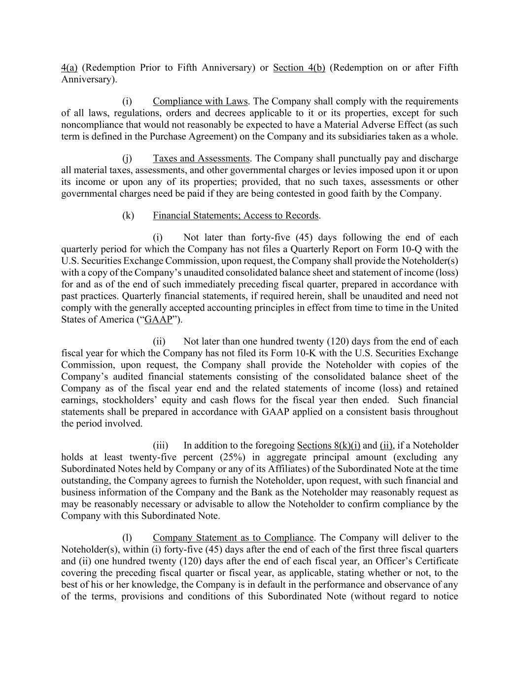 4(a) (Redemption Prior to Fifth Anniversary) or Section 4(b) (Redemption on or after Fifth Anniversary). (i) Compliance with Laws. The Company shall comply with the requirements of all laws, regulations, orders and decrees applicable to it or its properties, except for such noncompliance that would not reasonably be expected to have a Material Adverse Effect (as such term is defined in the Purchase Agreement) on the Company and its subsidiaries taken as a whole. (j) Taxes and Assessments. The Company shall punctually pay and discharge all material taxes, assessments, and other governmental charges or levies imposed upon it or upon its income or upon any of its properties; provided, that no such taxes, assessments or other governmental charges need be paid if they are being contested in good faith by the Company. (k) Financial Statements; Access to Records. (i) Not later than forty-five (45) days following the end of each quarterly period for which the Company has not files a Quarterly Report on Form 10-Q with the U.S. Securities Exchange Commission, upon request, the Company shall provide the Noteholder(s) with a copy of the Company’s unaudited consolidated balance sheet and statement of income (loss) for and as of the end of such immediately preceding fiscal quarter, prepared in accordance with past practices. Quarterly financial statements, if required herein, shall be unaudited and need not comply with the generally accepted accounting principles in effect from time to time in the United States of America (“GAAP”). (ii) Not later than one hundred twenty (120) days from the end of each fiscal year for which the Company has not filed its Form 10-K with the U.S. Securities Exchange Commission, upon request, the Company shall provide the Noteholder with copies of the Company’s audited financial statements consisting of the consolidated balance sheet of the Company as of the fiscal year end and the related statements of income (loss) and retained earnings, stockholders’ equity and cash flows for the fiscal year then ended. Such financial statements shall be prepared in accordance with GAAP applied on a consistent basis throughout the period involved. (iii) In addition to the foregoing Sections 8(k)(i) and (ii), if a Noteholder holds at least twenty-five percent (25%) in aggregate principal amount (excluding any Subordinated Notes held by Company or any of its Affiliates) of the Subordinated Note at the time outstanding, the Company agrees to furnish the Noteholder, upon request, with such financial and business information of the Company and the Bank as the Noteholder may reasonably request as may be reasonably necessary or advisable to allow the Noteholder to confirm compliance by the Company with this Subordinated Note. (l) Company Statement as to Compliance. The Company will deliver to the Noteholder(s), within (i) forty-five (45) days after the end of each of the first three fiscal quarters and (ii) one hundred twenty (120) days after the end of each fiscal year, an Officer’s Certificate covering the preceding fiscal quarter or fiscal year, as applicable, stating whether or not, to the best of his or her knowledge, the Company is in default in the performance and observance of any of the terms, provisions and conditions of this Subordinated Note (without regard to notice