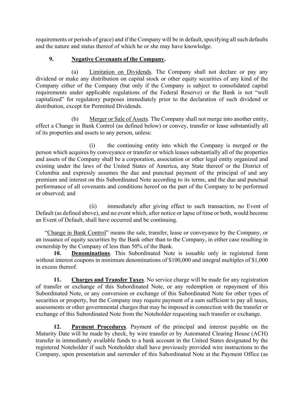 requirements or periods of grace) and if the Company will be in default, specifying all such defaults and the nature and status thereof of which he or she may have knowledge. 9. Negative Covenants of the Company. (a) Limitation on Dividends. The Company shall not declare or pay any dividend or make any distribution on capital stock or other equity securities of any kind of the Company either of the Company (but only if the Company is subject to consolidated capital requirements under applicable regulations of the Federal Reserve) or the Bank is not “well capitalized” for regulatory purposes immediately prior to the declaration of such dividend or distribution, except for Permitted Dividends. (b) Merger or Sale of Assets. The Company shall not merge into another entity, effect a Change in Bank Control (as defined below) or convey, transfer or lease substantially all of its properties and assets to any person, unless: (i) the continuing entity into which the Company is merged or the person which acquires by conveyance or transfer or which leases substantially all of the properties and assets of the Company shall be a corporation, association or other legal entity organized and existing under the laws of the United States of America, any State thereof or the District of Columbia and expressly assumes the due and punctual payment of the principal of and any premium and interest on this Subordinated Note according to its terms, and the due and punctual performance of all covenants and conditions hereof on the part of the Company to be performed or observed; and (ii) immediately after giving effect to such transaction, no Event of Default (as defined above), and no event which, after notice or lapse of time or both, would become an Event of Default, shall have occurred and be continuing. “Change in Bank Control” means the sale, transfer, lease or conveyance by the Company, or an issuance of equity securities by the Bank other than to the Company, in either case resulting in ownership by the Company of less than 50% of the Bank. 10. Denominations. This Subordinated Note is issuable only in registered form without interest coupons in minimum denominations of $100,000 and integral multiples of $1,000 in excess thereof. 11. Charges and Transfer Taxes. No service charge will be made for any registration of transfer or exchange of this Subordinated Note, or any redemption or repayment of this Subordinated Note, or any conversion or exchange of this Subordinated Note for other types of securities or property, but the Company may require payment of a sum sufficient to pay all taxes, assessments or other governmental charges that may be imposed in connection with the transfer or exchange of this Subordinated Note from the Noteholder requesting such transfer or exchange. 12. Payment Procedures. Payment of the principal and interest payable on the Maturity Date will be made by check, by wire transfer or by Automated Clearing House (ACH) transfer in immediately available funds to a bank account in the United States designated by the registered Noteholder if such Noteholder shall have previously provided wire instructions to the Company, upon presentation and surrender of this Subordinated Note at the Payment Office (as