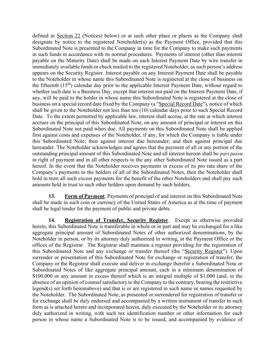 defined in Section 22 (Notices) below) or at such other place or places as the Company shall designate by notice to the registered Noteholder(s) as the Payment Office, provided that this Subordinated Note is presented to the Company in time for the Company to make such payments in such funds in accordance with its normal procedures. Payments of interest (other than interest payable on the Maturity Date) shall be made on each Interest Payment Date by wire transfer in immediately available funds or check mailed to the registered Noteholder, as such person’s address appears on the Security Register. Interest payable on any Interest Payment Date shall be payable to the Noteholder in whose name this Subordinated Note is registered at the close of business on the fifteenth (15th) calendar day prior to the applicable Interest Payment Date, without regard to whether such date is a Business Day, except that interest not paid on the Interest Payment Date, if any, will be paid to the holder in whose name this Subordinated Note is registered at the close of business on a special record date fixed by the Company (a “Special Record Date”), notice of which shall be given to the Noteholder not less than ten (10) calendar days prior to such Special Record Date. To the extent permitted by applicable law, interest shall accrue, at the rate at which interest accrues on the principal of this Subordinated Note, on any amount of principal or interest on this Subordinated Note not paid when due. All payments on this Subordinated Note shall be applied first against costs and expenses of the Noteholder, if any, for which the Company is liable under this Subordinated Note; then against interest due hereunder; and then against principal due hereunder. The Noteholder acknowledges and agrees that the payment of all or any portion of the outstanding principal amount of this Subordinated Note and all interest hereon shall be pari passu in right of payment and in all other respects to the any other Subordinated Note issued as a part hereof. In the event that the Noteholder receives payments in excess of its pro rata share of the Company’s payments to the holders of all of the Subordinated Notes, then the Noteholder shall hold in trust all such excess payments for the benefit of the other Noteholders and shall pay such amounts held in trust to such other holders upon demand by such holders. 13. Form of Payment. Payments of principal of and interest on this Subordinated Note shall be made in such coin or currency of the United States of America as at the time of payment shall be legal tender for the payment of public and private debts. 14. Registration of Transfer, Security Register. Except as otherwise provided herein, this Subordinated Note is transferable in whole or in part and may be exchanged for a like aggregate principal amount of Subordinated Notes of other authorized denominations, by the Noteholder in person, or by its attorney duly authorized in writing, at the Payment Office or the offices of the Registrar. The Registrar shall maintain a register providing for the registration of this Subordinated Note and any exchange or transfer thereof (the “Security Register”). Upon surrender or presentation of this Subordinated Note for exchange or registration of transfer, the Company or the Registrar shall execute and deliver in exchange therefor a Subordinated Note or Subordinated Notes of like aggregate principal amount, each in a minimum denomination of $100,000 or any amount in excess thereof which is an integral multiple of $1,000 (and, in the absence of an opinion of counsel satisfactory to the Company to the contrary, bearing the restrictive legend(s) set forth hereinabove) and that is or are registered in such name or names requested by the Noteholder. The Subordinated Note, as presented or surrendered for registration of transfer or for exchange shall be duly endorsed and accompanied by a written instrument of transfer in such form as is attached hereto and incorporated herein, duly executed by the Noteholder or its attorney duly authorized in writing, with such tax identification number or other information for each person in whose name a Subordinated Note is to be issued, and accompanied by evidence of