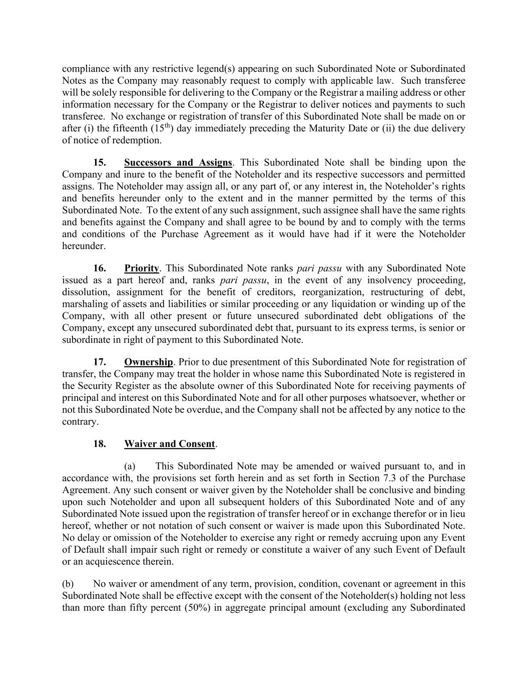 compliance with any restrictive legend(s) appearing on such Subordinated Note or Subordinated Notes as the Company may reasonably request to comply with applicable law. Such transferee will be solely responsible for delivering to the Company or the Registrar a mailing address or other information necessary for the Company or the Registrar to deliver notices and payments to such transferee. No exchange or registration of transfer of this Subordinated Note shall be made on or after (i) the fifteenth (15th) day immediately preceding the Maturity Date or (ii) the due delivery of notice of redemption. 15. Successors and Assigns. This Subordinated Note shall be binding upon the Company and inure to the benefit of the Noteholder and its respective successors and permitted assigns. The Noteholder may assign all, or any part of, or any interest in, the Noteholder’s rights and benefits hereunder only to the extent and in the manner permitted by the terms of this Subordinated Note. To the extent of any such assignment, such assignee shall have the same rights and benefits against the Company and shall agree to be bound by and to comply with the terms and conditions of the Purchase Agreement as it would have had if it were the Noteholder hereunder. 16. Priority. This Subordinated Note ranks pari passu with any Subordinated Note issued as a part hereof and, ranks pari passu, in the event of any insolvency proceeding, dissolution, assignment for the benefit of creditors, reorganization, restructuring of debt, marshaling of assets and liabilities or similar proceeding or any liquidation or winding up of the Company, with all other present or future unsecured subordinated debt obligations of the Company, except any unsecured subordinated debt that, pursuant to its express terms, is senior or subordinate in right of payment to this Subordinated Note. 17. Ownership. Prior to due presentment of this Subordinated Note for registration of transfer, the Company may treat the holder in whose name this Subordinated Note is registered in the Security Register as the absolute owner of this Subordinated Note for receiving payments of principal and interest on this Subordinated Note and for all other purposes whatsoever, whether or not this Subordinated Note be overdue, and the Company shall not be affected by any notice to the contrary. 18. Waiver and Consent. (a) This Subordinated Note may be amended or waived pursuant to, and in accordance with, the provisions set forth herein and as set forth in Section 7.3 of the Purchase Agreement. Any such consent or waiver given by the Noteholder shall be conclusive and binding upon such Noteholder and upon all subsequent holders of this Subordinated Note and of any Subordinated Note issued upon the registration of transfer hereof or in exchange therefor or in lieu hereof, whether or not notation of such consent or waiver is made upon this Subordinated Note. No delay or omission of the Noteholder to exercise any right or remedy accruing upon any Event of Default shall impair such right or remedy or constitute a waiver of any such Event of Default or an acquiescence therein. (b) No waiver or amendment of any term, provision, condition, covenant or agreement in this Subordinated Note shall be effective except with the consent of the Noteholder(s) holding not less than more than fifty percent (50%) in aggregate principal amount (excluding any Subordinated