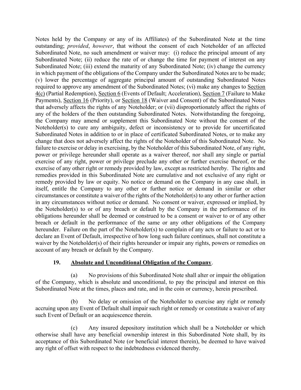 Notes held by the Company or any of its Affiliates) of the Subordinated Note at the time outstanding; provided, however, that without the consent of each Noteholder of an affected Subordinated Note, no such amendment or waiver may: (i) reduce the principal amount of any Subordinated Note; (ii) reduce the rate of or change the time for payment of interest on any Subordinated Note; (iii) extend the maturity of any Subordinated Note; (iv) change the currency in which payment of the obligations of the Company under the Subordinated Notes are to be made; (v) lower the percentage of aggregate principal amount of outstanding Subordinated Notes required to approve any amendment of the Subordinated Notes; (vi) make any changes to Section 4(c) (Partial Redemption), Section 6 (Events of Default; Acceleration), Section 7 (Failure to Make Payments), Section 16 (Priority), or Section 18 (Waiver and Consent) of the Subordinated Notes that adversely affects the rights of any Noteholder; or (vii) disproportionately affect the rights of any of the holders of the then outstanding Subordinated Notes. Notwithstanding the foregoing, the Company may amend or supplement this Subordinated Note without the consent of the Noteholder(s) to cure any ambiguity, defect or inconsistency or to provide for uncertificated Subordinated Notes in addition to or in place of certificated Subordinated Notes, or to make any change that does not adversely affect the rights of the Noteholder of this Subordinated Note. No failure to exercise or delay in exercising, by the Noteholder of this Subordinated Note, of any right, power or privilege hereunder shall operate as a waiver thereof, nor shall any single or partial exercise of any right, power or privilege preclude any other or further exercise thereof, or the exercise of any other right or remedy provided by law, except as restricted hereby. The rights and remedies provided in this Subordinated Note are cumulative and not exclusive of any right or remedy provided by law or equity. No notice or demand on the Company in any case shall, in itself, entitle the Company to any other or further notice or demand in similar or other circumstances or constitute a waiver of the rights of the Noteholder(s) to any other or further action in any circumstances without notice or demand. No consent or waiver, expressed or implied, by the Noteholder(s) to or of any breach or default by the Company in the performance of its obligations hereunder shall be deemed or construed to be a consent or waiver to or of any other breach or default in the performance of the same or any other obligations of the Company hereunder. Failure on the part of the Noteholder(s) to complain of any acts or failure to act or to declare an Event of Default, irrespective of how long such failure continues, shall not constitute a waiver by the Noteholder(s) of their rights hereunder or impair any rights, powers or remedies on account of any breach or default by the Company. 19. Absolute and Unconditional Obligation of the Company. (a) No provisions of this Subordinated Note shall alter or impair the obligation of the Company, which is absolute and unconditional, to pay the principal and interest on this Subordinated Note at the times, places and rate, and in the coin or currency, herein prescribed. (b) No delay or omission of the Noteholder to exercise any right or remedy accruing upon any Event of Default shall impair such right or remedy or constitute a waiver of any such Event of Default or an acquiescence therein. (c) Any insured depository institution which shall be a Noteholder or which otherwise shall have any beneficial ownership interest in this Subordinated Note shall, by its acceptance of this Subordinated Note (or beneficial interest therein), be deemed to have waived any right of offset with respect to the indebtedness evidenced thereby.
