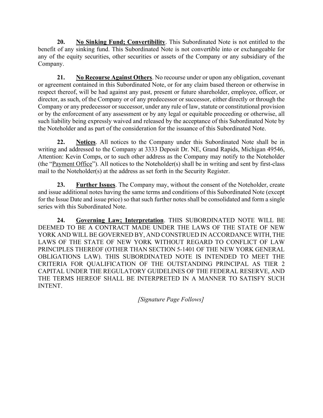 20. No Sinking Fund; Convertibility. This Subordinated Note is not entitled to the benefit of any sinking fund. This Subordinated Note is not convertible into or exchangeable for any of the equity securities, other securities or assets of the Company or any subsidiary of the Company. 21. No Recourse Against Others. No recourse under or upon any obligation, covenant or agreement contained in this Subordinated Note, or for any claim based thereon or otherwise in respect thereof, will be had against any past, present or future shareholder, employee, officer, or director, as such, of the Company or of any predecessor or successor, either directly or through the Company or any predecessor or successor, under any rule of law, statute or constitutional provision or by the enforcement of any assessment or by any legal or equitable proceeding or otherwise, all such liability being expressly waived and released by the acceptance of this Subordinated Note by the Noteholder and as part of the consideration for the issuance of this Subordinated Note. 22. Notices. All notices to the Company under this Subordinated Note shall be in writing and addressed to the Company at 3333 Deposit Dr. NE, Grand Rapids, Michigan 49546, Attention: Kevin Comps, or to such other address as the Company may notify to the Noteholder (the “Payment Office”). All notices to the Noteholder(s) shall be in writing and sent by first-class mail to the Noteholder(s) at the address as set forth in the Security Register. 23. Further Issues. The Company may, without the consent of the Noteholder, create and issue additional notes having the same terms and conditions of this Subordinated Note (except for the Issue Date and issue price) so that such further notes shall be consolidated and form a single series with this Subordinated Note. 24. Governing Law; Interpretation. THIS SUBORDINATED NOTE WILL BE DEEMED TO BE A CONTRACT MADE UNDER THE LAWS OF THE STATE OF NEW YORK AND WILL BE GOVERNED BY, AND CONSTRUED IN ACCORDANCE WITH, THE LAWS OF THE STATE OF NEW YORK WITHOUT REGARD TO CONFLICT OF LAW PRINCIPLES THEREOF (OTHER THAN SECTION 5-1401 OF THE NEW YORK GENERAL OBLIGATIONS LAW). THIS SUBORDINATED NOTE IS INTENDED TO MEET THE CRITERIA FOR QUALIFICATION OF THE OUTSTANDING PRINCIPAL AS TIER 2 CAPITAL UNDER THE REGULATORY GUIDELINES OF THE FEDERAL RESERVE, AND THE TERMS HEREOF SHALL BE INTERPRETED IN A MANNER TO SATISFY SUCH INTENT. [Signature Page Follows]