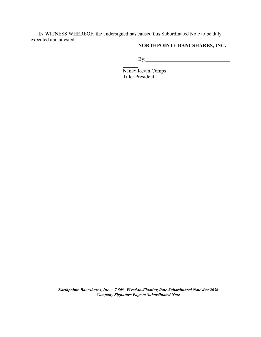 IN WITNESS WHEREOF, the undersigned has caused this Subordinated Note to be duly executed and attested. NORTHPOINTE BANCSHARES, INC. By:_________________________________ ______ Name: Kevin Comps Title: President Northpointe Bancshares, Inc. – 7.50% Fixed-to-Floating Rate Subordinated Note due 2036 Company Signature Page to Subordinated Note